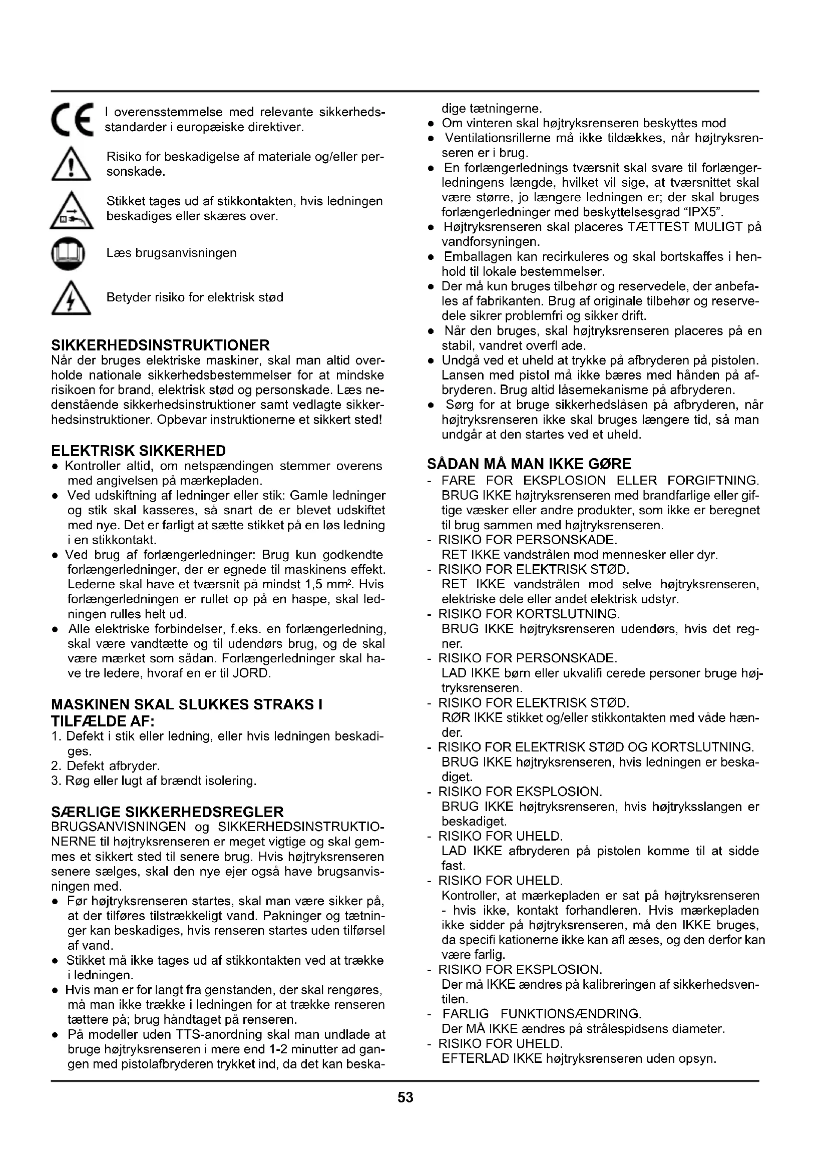 BRUGSANVISNINGEN og SIKKERHEDSINSTRUKTIO- NERNE til højtryksrenseren er meget vigtige og skal gem- mes et sikkert sted til senere brug. Hvis højtryksrenseren senere sælges, skal den nye ejer også have brugsanvis- ningen med. Før højtryksrenseren startes, skal man være sikker på, at der tilføres tilstrækkeligt vand. Pakninger og tætnin- ger kan beskadiges, hvis renseren startes uden tilførsel af vand. Stikket må ikke tages ud af stikkontakten ved at trække i ledningen. Hvis man er for langt fra genstanden, der skal rengøres, må man ikke trække i ledningen for at trække renseren tættere på; brug håndtaget på renseren. På modeller uden TTS-anordning skal man undlade at bruge højtryksrenseren i mere end 1-2 minutter ad gan- gen med pistolafbryderen trykket ind, da det kan beska- dige tætningerne. Om vinteren skal højtryksrenseren beskyttes mod Ventilationsrillerne må ikke tildækkes, når højtryksren- seren er i brug. En forlængerlednings tværsnit skal svare til forlænger- ledningens længde, hvilket vil sige, at tværsnittet skal være større, jo længere ledningen er; der skal bruges forlængerledninger med beskyttelsesgrad “IPX5”. Højtryksrenseren skal placeres TÆTTEST MULIGT på vandforsyningen. Emballagen kan recirkuleres og skal bortskaffes i hen- hold til lokale bestemmelser. Der må kun bruges tilbehør og reservedele, der anbefa- les af fabrikanten. Brug af originale tilbehør og reserve- dele sikrer problemfri og sikker drift. Når den bruges, skal højtryksrenseren placeres på en stabil, vandret over` ade. Undgå ved et uheld at trykke på afbryderen på pistolen. Lansen med pistol må ikke bæres med hånden på af- bryderen. Brug altid låsemekanisme på afbryderen. Sørg for at bruge sikkerhedslåsen på afbryderen, når højtryksrenseren ikke skal bruges længere tid, så man undgår at den startes ved et uheld. SÅDAN MÅ MAN IKKE GØRE - FARE FOR EKSPLOSION ELLER FORGIFTNING. BRUG IKKE højtryksrenseren med brandfarlige eller gif- tige væsker eller andre produkter, som ikke er beregnet til brug sammen med højtryksrenseren. - RISIKO FOR PERSONSKADE. RET IKKE vandstrålen mod mennesker eller dyr. - RISIKO FOR ELEKTRISK STØD. RET IKKE vandstrålen mod selve højtryksrenseren, elektriske dele eller andet elektrisk udstyr. - RISIKO FOR KORTSLUTNING. BRUG IKKE højtryksrenseren udendørs, hvis det reg- ner. - RISIKO FOR PERSONSKADE. LAD IKKE børn eller ukvali^ cerede personer bruge høj- tryksrenseren. - RISIKO FOR ELEKTRISK STØD. RØR IKKE stikket og/eller stikkontakten med våde hæn- der. - RISIKO FOR ELEKTRISK STØD OG KORTSLUTNING. BRUG IKKE højtryksrenseren, hvis ledningen er beska- diget. - RISIKO FOR EKSPLOSION. BRUG IKKE højtryksrenseren, hvis højtryksslangen er beskadiget. - RISIKO FOR UHELD. LAD IKKE afbryderen på pistolen komme til at sidde fast. - RISIKO FOR UHELD. Kontroller, at mærkepladen er sat på højtryksrenseren - hvis ikke, kontakt forhandleren. Hvis mærkepladen ikke sidder på højtryksrenseren, må den IKKE bruges, da speci^ kationerne ikke kan a` æses, og den derfor kan være farlig. - RISIKO FOR EKSPLOSION. Der må IKKE ændres på kalibreringen af sikkerhedsven- tilen. - FARLIG FUNKTIONSÆNDRING. Der MÅ IKKE ændres på strålespidsens diameter. - RISIKO FOR UHELD. EFTERLAD IKKE højtryksrenseren uden opsyn.54