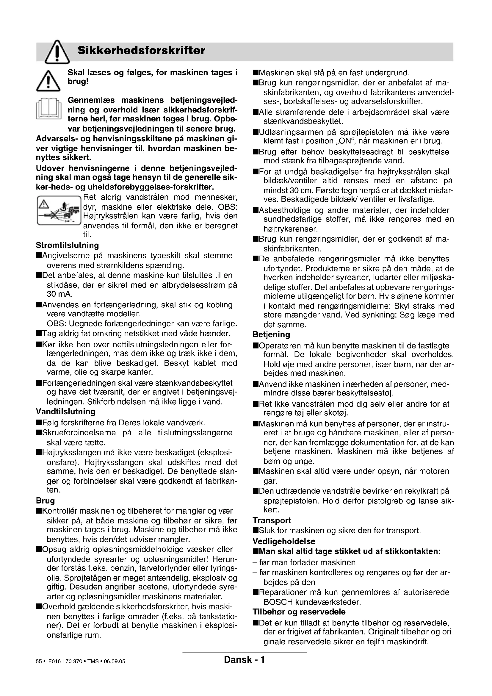 is lager dan 91 dB (A). Waarderingsme- thode van de conformiteit volgens aanhangsel VIII. Leinfelden, 01.11.2004. Dr. Egbert Schneider Dr. Eckerhard Strötgen Senior Vice President Head of Product Engineering Certification Robert Bosch GmbH, Power Tools Division Wijzigingen voorbehouden Milieubescherming Afvalverwijdering Klantenservice Conformiteitsverklaring F016 L70 370.book Seite 7 Donnerstag, 29. September 2005 10:40 10 54 • F016 L70 370 • TMS • 06.09.05Dansk - 1 Skal læses og følges, før maskinen tages i brug! Gennemlæs maskinens betjeningsvejled- ning og overhold især sikkerhedsforskrif- terne heri, før maskinen tages i brug. Opbe- var betjeningsvejledningen til senere brug. Advarsels- og henvisningsskiltene på maskinen gi- ver vigtige henvisninger til, hvordan maskinen be- nyttes sikkert. Udover henvisningerne i denne betjeningsvejled- ning skal man også tage hensyn til de generelle sik- ker-heds- og uheldsforebyggelses-forskrifter. Ret aldrig vandstrålen mod mennesker, dyr, maskine eller elektriske dele. OBS: Højtryksstrålen kan være farlig, hvis den anvendes til formål, den ikke er beregnet til. Strømtilslutning ■ Angivelserne på maskinens typeskilt skal stemme overens med strømkildens spænding. ■ Det anbefales, at denne maskine kun tilsluttes til en stikdåse, der er sikret med en afbrydelsesstrøm på 30 mA. ■ Anvendes en forlængerledning, skal stik og kobling være vandtætte modeller. OBS: Uegnede forlængerledninger kan være farlige. ■ Tag aldrig fat omkring netstikket med våde hænder. ■ Kør ikke hen over nettilslutningsledningen eller for- længerledningen, mas dem ikke og træk ikke i dem, da de kan blive beskadiget. Beskyt kablet mod varme, olie og skarpe kanter. ■ Forlængerledningen skal være stænkvandsbeskyttet og have det tværsnit, der er angivet i betjeningsvej- ledningen. Stikforbindelsen må ikke ligge i vand. Vandtilslutning ■ Følg forskrifterne fra Deres lokale vandværk. ■ Skrueforbindelserne på alle tilslutningsslangerne skal være tætte. ■ Højtryksslangen må ikke være beskadiget (eksplosi- onsfare). Højtryksslangen skal udskiftes med det samme, hvis den er beskadiget. De benyttede slan- ger og forbindelser skal være godkendt af fabrikan- ten. Brug ■ Kontrollér maskinen og tilbehøret for mangler og vær sikker på, at både maskine og tilbehør er sikre, før maskinen tages i brug. Maskine og tilbehør må ikke benyttes, hvis den/det udviser mangler. ■ Opsug aldrig opløsningsmiddelholdige væsker eller ufortyndede syrearter og opløsningsmidler! Herun- der forstås f.eks. benzin, farvefortynder eller fyrings- olie. Sprøjtetågen er meget antændelig, eksplosiv og giftig. Desuden angriber acetone, ufortyndede syre- arter og opløsningsmidler maskinens materialer. ■ Overhold gældende sikkerhedsforskriter, hvis maski- nen benyttes i farlige områder (f.eks. på tankstatio- ner). Det er forbudt at benytte maskinen i eksplosi- onsfarlige rum. ■ Maskinen skal stå på en fast undergrund. ■ Brug kun rengøringsmidler, der er anbefalet af ma- skinfabrikanten, og overhold fabrikantens anvendel- ses-, bortskaffelses- og advarselsforskrifter. ■ Alle strømførende dele i arbejdsområdet skal være stænkvandsbeskyttet. ■ Udløsningsarmen på sprøjtepistolen må ikke være klemt fast i position „ON“, når maskinen er i brug. ■ Brug efter behov beskyttelsesdragt til beskyttelse mod stænk fra tilbagesprøjtende vand. ■ For at undgå beskadigelser fra højtryksstrålen skal bildæk/ventiler altid renses med en afstand på mindst 30 cm. Første tegn herpå er at dækket misfar- ves. Beskadigede bildæk/ ventiler er livsfarlige. ■ Asbestholdige og andre materialer, der indeholder sundhedsfarlige stoffer, må ikke rengøres med en højtryksrenser. ■ Brug kun rengøringsmidler, der er godkendt af ma- skinfabrikanten. ■ De anbefalede rengøringsmidler må ikke benyttes ufortyndet. Produkterne er sikre på den måde, at de hverken indeholder syrearter, ludarter eller miljøska- delige stoffer. Det anbefales at opbevare rengørings- midlerne utilgængeligt for børn. Hvis øjnene kommer i kontakt med rengøringsmidlerne: Skyl straks med store mængder vand. Ved synkning: Søg læge med det samme. Betjening ■ Operatøren må kun benytte maskinen til de fastlagte formål. De lokale begivenheder skal overholdes. Hold øje med andre personer, især børn, når der ar- bejdes med maskinen. ■ Anvend ikke maskinen i nærheden af personer, med- mindre disse bærer beskyttelsestøj. ■ Ret ikke vandstrålen mod dig selv eller andre for at rengøre tøj eller skotøj. ■ Maskinen må kun benyttes af personer, der er instru- eret i at bruge og håndtere maskinen, eller af perso- ner, der kan fremlægge dokumentation for, at de kan betjene maskinen. Maskinen må ikke betjenes af børn og unge. ■ Maskinen skal altid være under opsyn, når motoren går. ■ Den udtrædende vandstråle bevirker en rekylkraft på sprøjtepistolen. Hold derfor pistolgreb og lanse sik- kert. Transport ■ Sluk for maskinen og sikre den før transport. Vedligeholdelse ■ Man skal altid tage stikket ud af stikkontakten: – før man forlader maskinen – før maskinen kontrolleres og rengøres og før der ar- bejdes på den ■ Reparationer må kun gennemføres af autoriserede BOSCH kundeværksteder. Tilbehør og reservedele ■ Det er kun tilladt at benytte tilbehør og reservedele, der er frigivet af fabrikanten. Originalt tilbehør og ori- ginale reservedele sikrer en fejlfri maskindrift. Sikkerhedsforskrifter F016 L70 370.book Seite 1 Donnerstag, 29. September 2005 10:40 10 55 • F016 L70 370 • TMS • 06.09.05Dansk - 2 Maskinen er beregnet til at rengøre flader og gen- stande udendørs, værktøj, køretøjer og både. Kom- mes et af Bosch godkendt rengøringsmiddel i van- det og forsynes maskinen med det rigtige tilbehør, kan maskinen også benyttes til at frigøre afløbsrør eller fjerne rust og gammel f