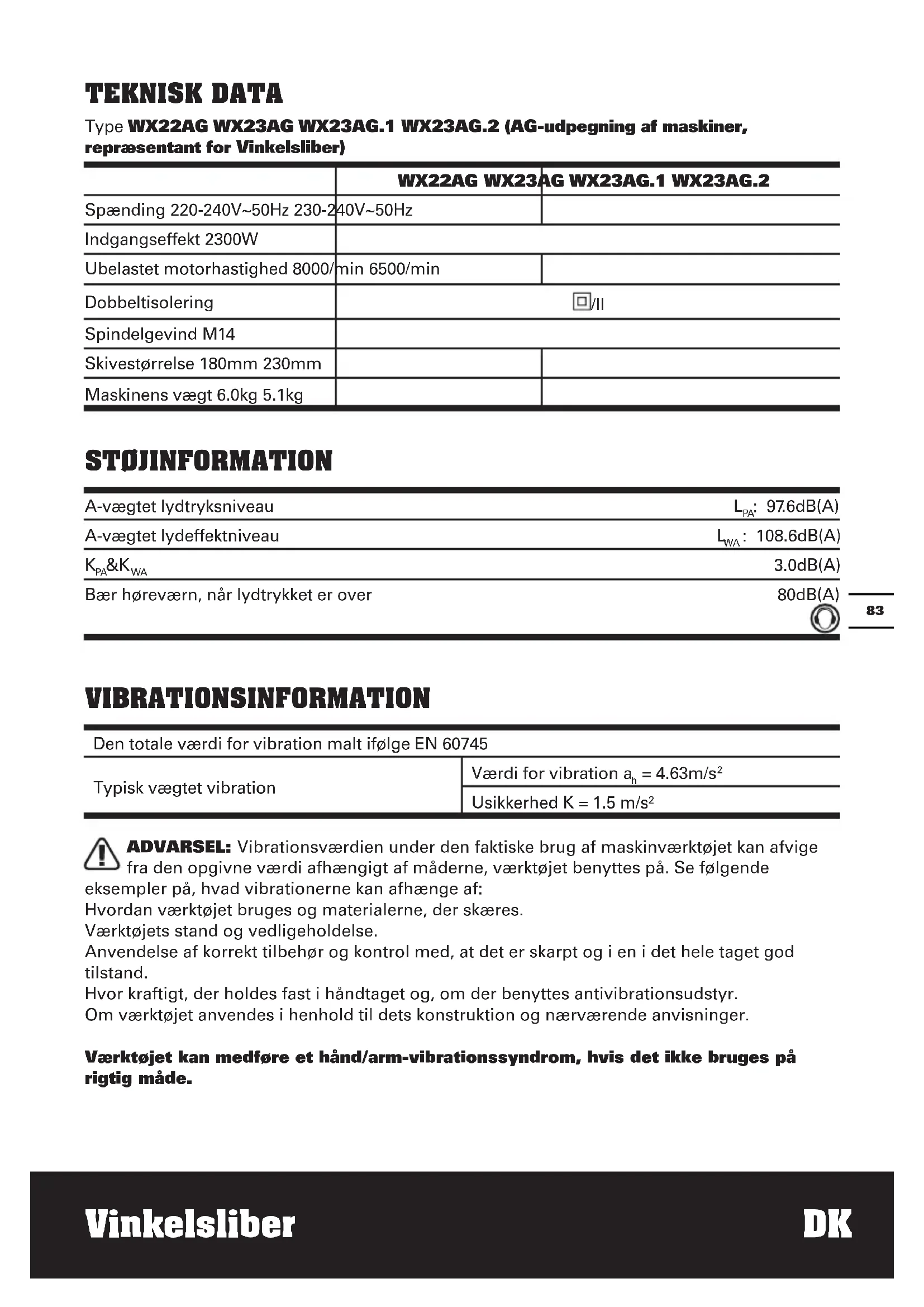 C eller lavere. Planlæg dit arbejde, så du kan fordele arbejde med kraftige vibrationer over flere dage. TILBEHØR Nøgle 1 Lavvibrationshåndtag 1 Metalskæredisk (WX22AG WX23AG WX23AG.1) 1 Det anbefales, at alt udstyr købes i samme butik som maskinen. Anvend udstyr af god kvalitet og af et velkendt mærke. Vælg slibepapir afhængigt af opgaven. Se på emballagen til tilbehøret for at få yderligere oplysninger. Få hjælp og råd i butikken.Vinkelsliber DK