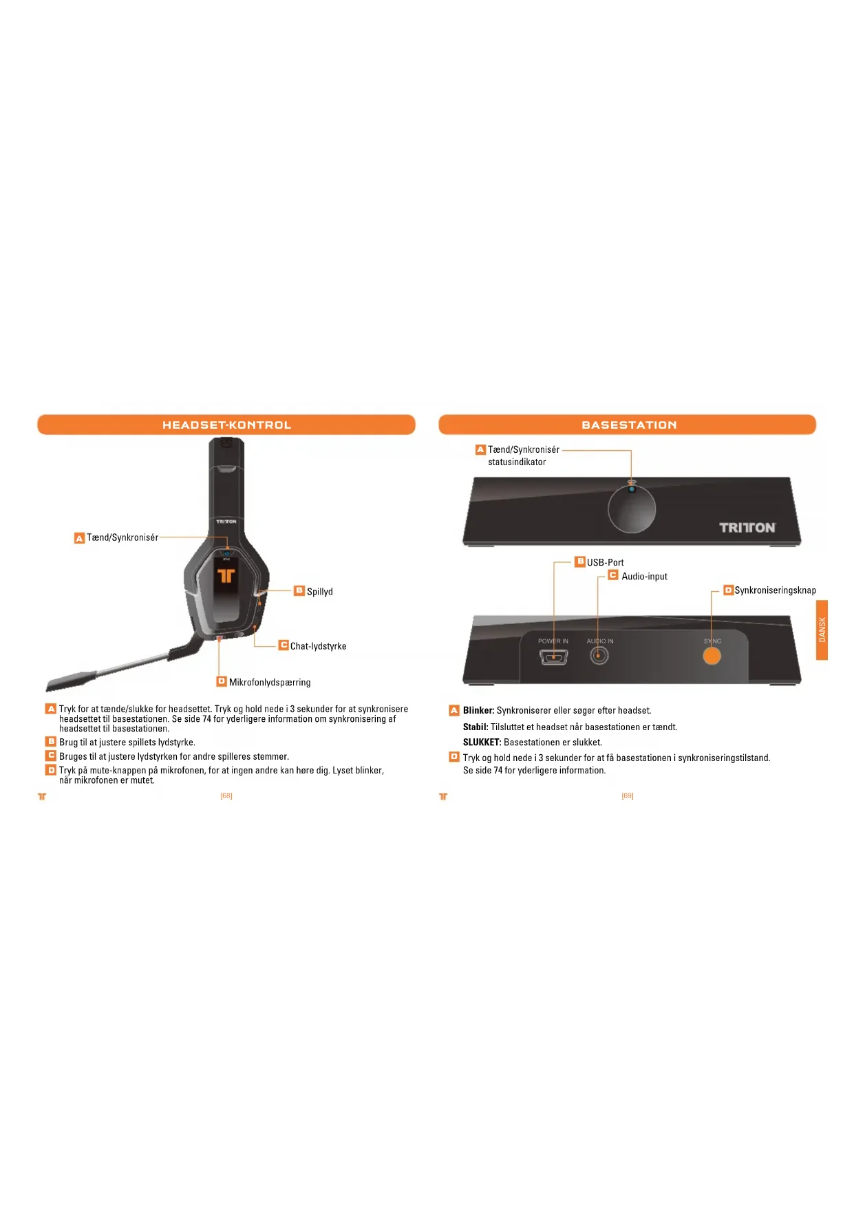 HeaDset-kontrol Tænd/Synkronisér Tryk for at tænde/slukke for headsettet. Tryk og hold nede i 3 sekunder for at synkronisere headsettet til basestationen. Se side 74 for yderligere information om synkronisering af headsettet til basestationen. Brug til at justere spillets lydstyrke. Bruges til at justere lydstyrken for andre spilleres stemmer. Tryk på mute-knappen på mikrofonen, for at ingen andre kan høre dig. Lyset blinker, når mikrofonen er mutet. Spillyd Chat-lydstyrke Mikrofonlydspærring basestatIon AUDIO IN SYNC POWER IN Tænd/Synkronisér statusindikator Blinker: Synkroniserer eller søger efter headset. Stabil: Tilsluttet et headset når basestationen er tændt. SLUKKET: Basestationen er slukket. USB-Port Audio-input Synkroniseringsknap Tryk og hold nede i 3 sekunder for at få basestationen i synkroniseringstilstand. Se side 74 for yderligere information.