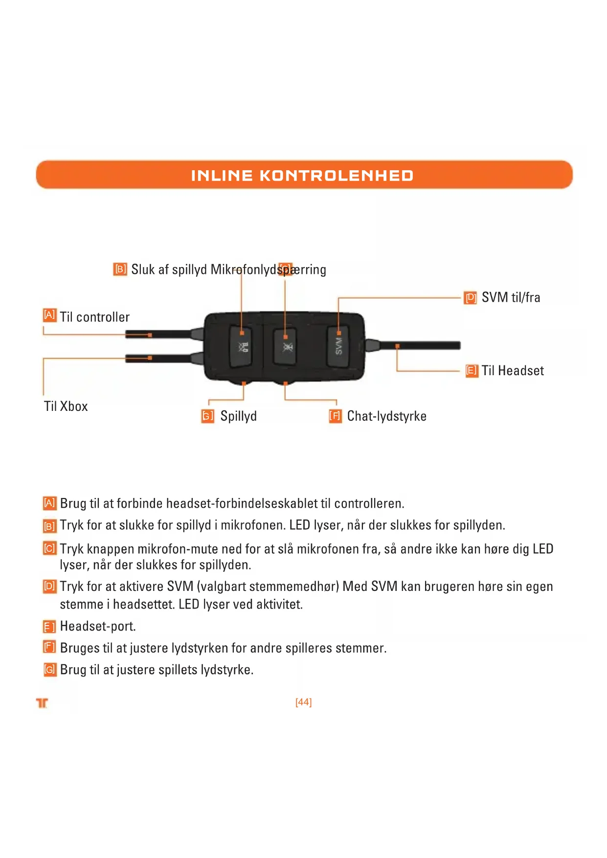 - Justér mikrofonen til den ønskede placering Omsluttende headset-design ADVARSEL KABLET HEADSET Før dette produkt tages i brug, skal manualerne for dette tilbehør og Xbox 360-konsollen læses for vigtig sikkerheds- og sundhedsvejled- ning. Behold alle manualer til fremtidig brug. Se www.xbox.com/support eller ring til Xbox Kundeservice for erstatningsmanualer til Xbox.