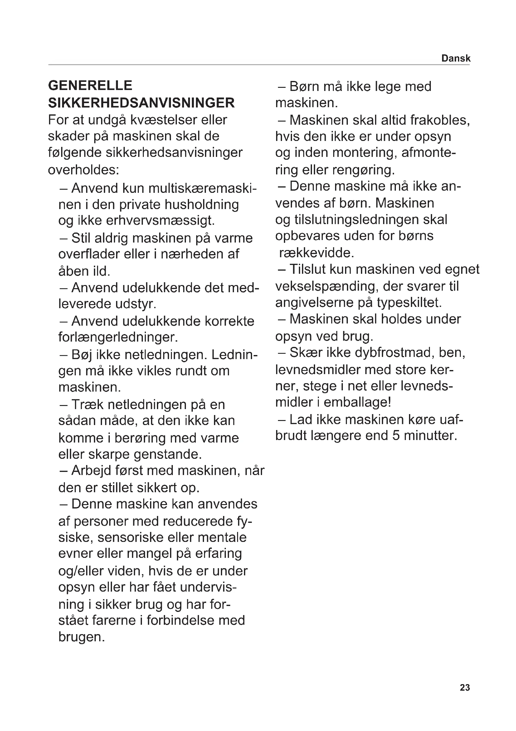Při potřebě servisu, oprav a obstarání náhradních dílů se obracejte na místní zákaznický servis. Viz www.ritterwerk.de TECHNICKÉ ÚDAJE Přístroj vyhovuje předpisům CE. Napájecí napětí / příkon: viz výrobní štítek na spodní části přístroje Tloušťka řezu: 0 mm až cca 23 mm ZÁRUKA Na tento univerzální kráječ ritter poskytujeme dvouletou záruku výrobce, počítanou od data za- koupení a odpovídající záručním předpisům EU. Vaše zákonné nároky ze záruky podle § 437 a násl. BGB (německého občan- ského zákoníku) zůstávají tímto nařízením nedotčeny. Záruka výrobce se vztahuje na všechna zařízení prodávaná v Evropské unii. Záruční podmínky si můžete prohlédnout na www.ritterwerk.de/warranty. Při uplatňování nároků ze záruky nebo potřebě poprodejního servi- su je přístroj nutné zaslat zákaz- nickému servisu v dané zemi.23 Dansk GENERELLE SIKKERHEDS ANVISNINGER For at undgå kvæstelser eller skader på maskinen skal de følgende sikkerhedsanvisninger overholdes: – Anvend kun multiskæremaski- nen i den private husholdning og ikke erhvervsmæssigt. – Stil aldrig maskinen på varme overader eller i nærheden af åben ild. – Anvend udelukkende det med- leverede udstyr. – Anvend udelukkende korrekte forlængerledninger. – Bøj ikke netledningen. Lednin- gen må ikke vikles rundt om maskinen. – Træk netledningen på en sådan måde, at den ikke kan komme i berøring med varme eller skarpe genstande. – Arbejd først med maskinen, når den er stillet sikkert op. – Denne maskine kan anvendes af personer med reducerede fy- siske, sensoriske eller mentale evner eller mangel på erfaring og/eller viden, hvis de er under opsyn eller har fået undervis- ning i sikker brug og har for- stået farerne i forbindelse med brugen. – Børn må ikke lege med maskinen. – Maskinen skal altid frakobles, hvis den ikke er under opsyn og inden montering, afmonte- ring eller rengøring. – Denne maskine må ikke an- vendes af børn. Maskinen og tilslutningsledningen skal opbevares uden for børns rækkevidde. – Tilslut kun maskinen ved egnet vekselspænding, der svarer til angivelserne på typeskiltet. – Maskinen skal holdes under opsyn ved brug. – Skær ikke dybfrostmad, ben, levnedsmidler med store ker- ner, stege i net eller levneds- midler i emballage! – Lad ikke maskinen køre uaf- brudt længere end 5 minutter.24 Fare for stød – Træk altid stikket ud af stikkon- takten ved driftsforstyrrelser, før hver rengøring eller hvis maskinen ikke anvendes. Træk i stikket og ikke i ledningen. – Dyp aldrig maskinen i vand. Udsæt aldrig maskinen for regn eller anden form for fugtighed. Hvis maskinen alligevel skulle falde ned i vandet, skal du først trække stikket ud af stikkontak- ten og derefter tage maskinen op af vandet. Få derefter kon- trolleret maskinen af et god- kendt servicested, før den atter tages i brug. – Anvend ikke maskinen med fugtige hænder. Anvend den ikke, hvis det er fugtigt eller vådt, eller hvis du står på et fugtigt gulv. Anvend ikke maski- nen udenfor. – Stands straks brugen ved be- skadigelse af maskindele, og kontakt ritter-kundeservice. – Hvis netledningen beskadiges, skal den udskiftes af producen- ten, kundeservicen eller lig- nende, kvalicerede personer, så farer undgås. Fare for kvæstelser – Denne maskine må ikke an- vendes uden skiveslæde eller sikkerhedsholder medmindre størrelsen eller formen på det, der skal skæres ikke muliggør brugen af disse. – Før udskiftning af tilbehør eller ekstradele, der skal bevæges under driften, skal maskinen slukkes og frakobles. – Rundkniven er meget skarp. – Rør aldrig ved rundkniven un- der brugen! – Sluk maskinen inden rengørin- gen, træk stikket ud af stikkon- takten og drej justeringsknap- pen for skivetykkelse om på position "0". – Rundkniven fortsætter med at køre en smule efter frakoblingen. Dansk25 Klap billederne i den forreste og bageste bogryg ud. Læs anvisningen omhyggeligt, inden maskinen tages i brug. Opbevar brugsanvisningen, og udlever den, hvis maskinen vide- regives til en anden. Alternativt er den aktuelle brugs- anvisning til rådighed på www.ritterwerk.de. FORMÅL Multiskæremaskinen anvendes til at skære normale levnedsmidler i husholdningen. Multiskæremaskinen er egnet til kontakt med levnedsmidler. Ikke korrekt brug eller forkert betjening kan medføre alvorlige kvæstelser eller beskadigelse af maskinen. I det tilfælde bortfalder samtlige garanti- og ansvarskrav. IBRUGTAGNING Forberedelse Tag maskinen forsigtigt ud af emballagen. Fjern alle emballa- gedele og opbevar disse sammen med resten af emballagen. Ren- gør maskinen, før den kommer i kontakt med levnedsmidler (se RENGØRING). Opstilling af maskinen