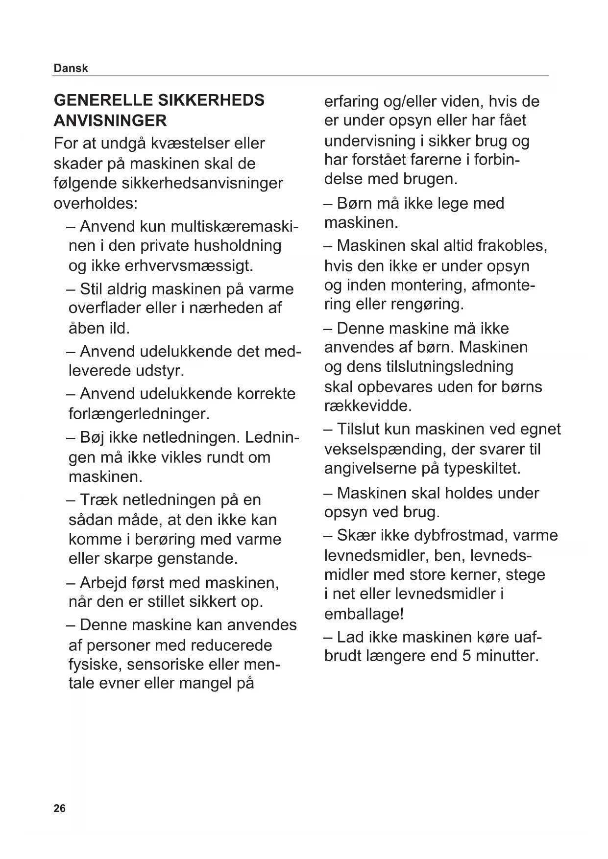 Symbol Význam Označení CE: Výrobek odpovídá platným nařízením Evropské unie. Výrobek byl uveden na trh po 13. srpnu 2005. Nesmí být likvidován s běžným domovním odpadem. Symbol přeškrtnutého kontejneru upozorňuje na nutnost třídění odpadu. Určeno pro kontakt s potravinami Přístroj třídy ochrany II26 Dansk GENERELLE SIKKERHEDS ANVISNINGER For at undgå kvæstelser eller skader på maskinen skal de følgende sikkerhedsanvisninger overholdes: – Anvend kun multiskæremaski nen i den private husholdning og ikke erhvervsmæssigt. – Stil aldrig maskinen på varme overader eller i nærheden af åben ild. – Anvend udelukkende det med- leverede udstyr. – Anvend udelukkende korrekte forlængerledninger. – Bøj ikke netledningen. Lednin- gen må ikke vikles rundt om maskinen. – Træk netledningen på en sådan måde, at den ikke kan komme i berøring med varme eller skarpe genstande. – Arbejd først med maskinen, når den er stillet sikkert op. – Denne maskine kan anvendes af personer med reducerede fysiske, sensoriske eller men- tale evner eller mangel på erfaring og/eller viden, hvis de er under opsyn eller har fået undervisning i sikker brug og har forstået farerne i forbin