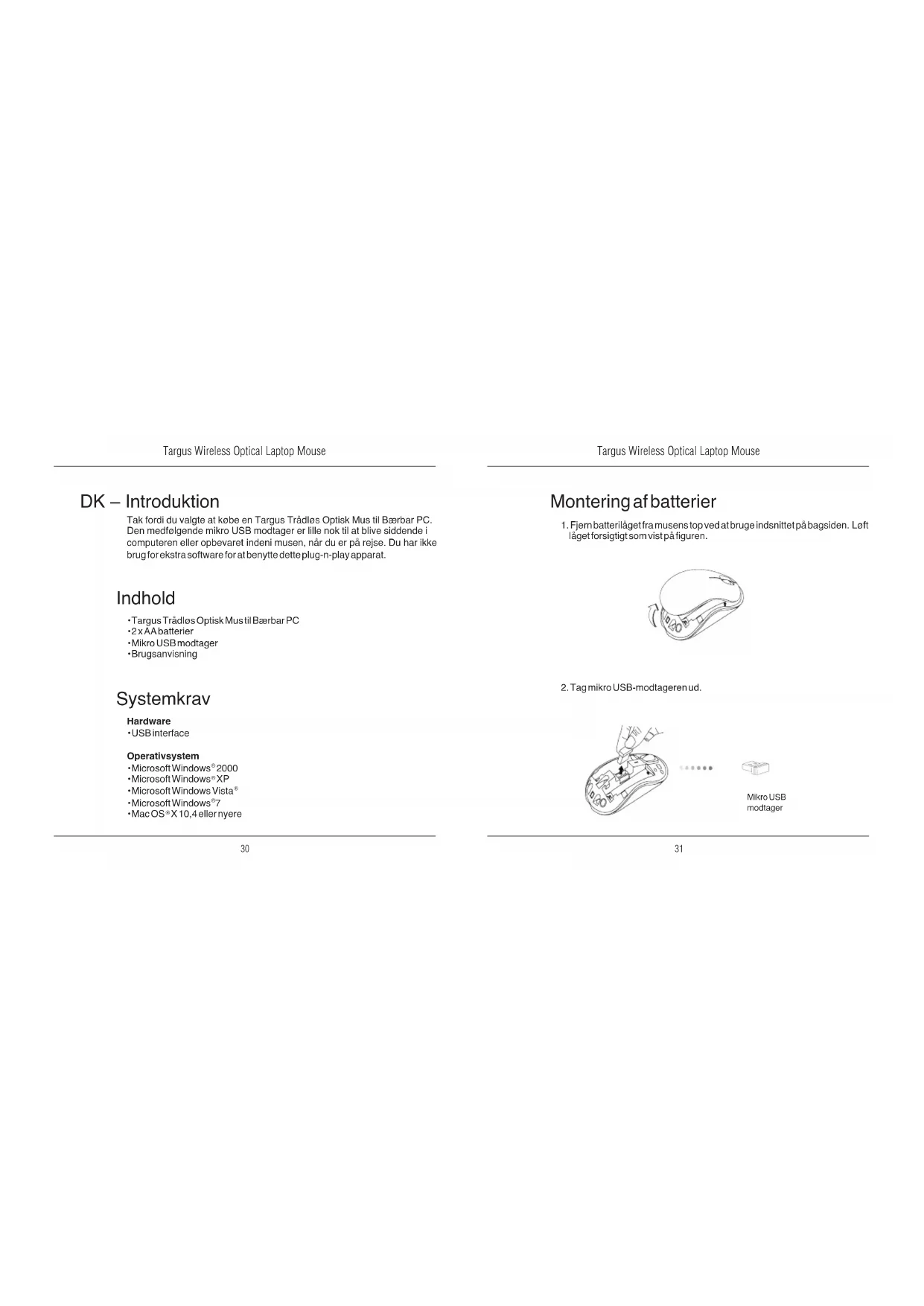 DK – Introduktion Tak fordi du valgte at købe en Targus Trådløs Optisk Mus til Bærbar PC. Den medfølgende mikro USB modtager er lille nok til at blive siddende i computeren eller opbevaret indeni musen, når du er på rejse. Du har ikke brug for ekstra software for at benytte dette plug-n-play apparat. Systemkrav Hardware