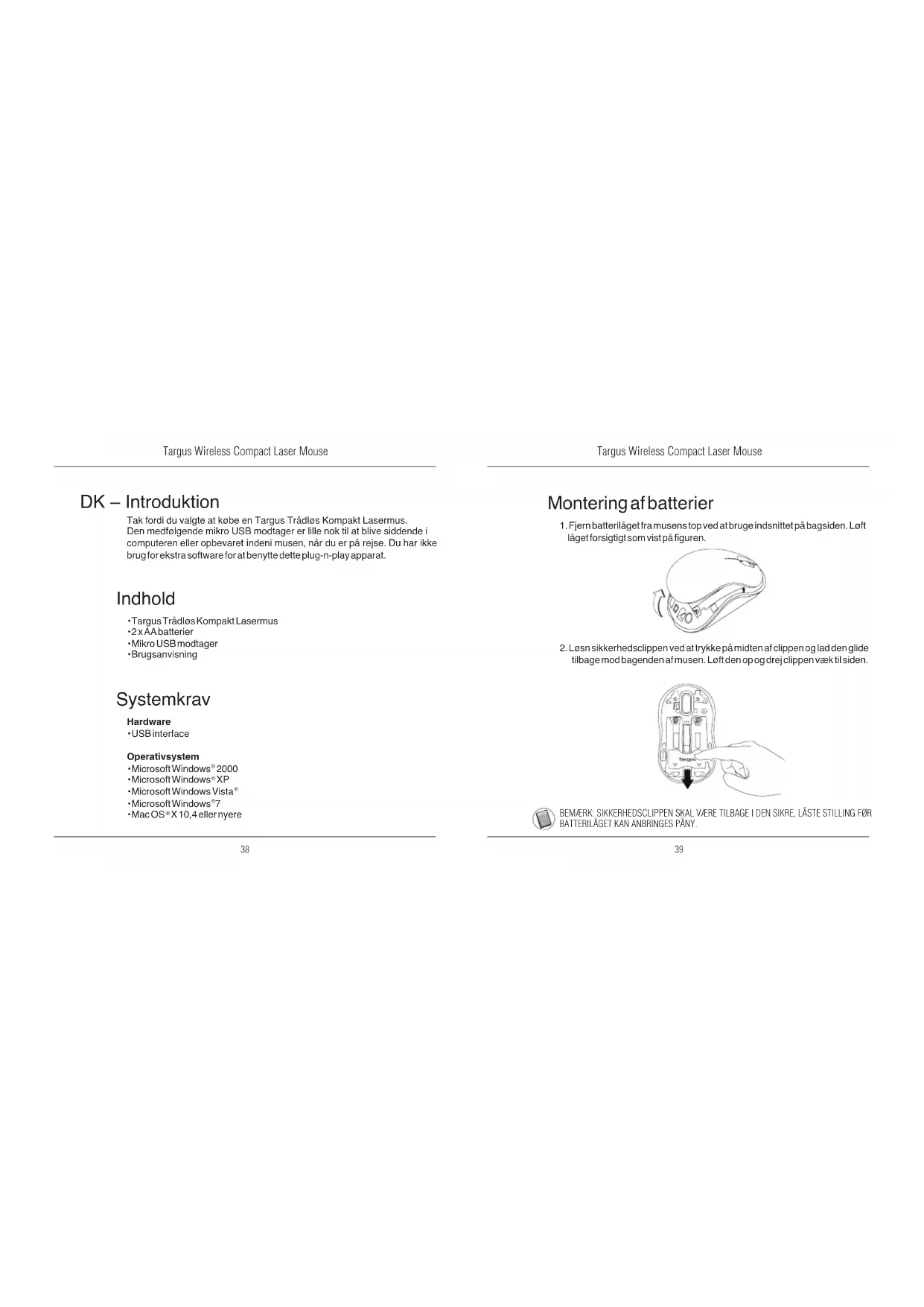 DK – Introduktion Tak fordi du valgte at købe en Targus Trådløs Kompakt Lasermus. Den medfølgende mikro USB modtager er lille nok til at blive siddende i computeren eller opbevaret indeni musen, når du er på rejse. Du har ikke brug for ekstra software for at benytte dette plug-n-play apparat. Systemkrav Hardware