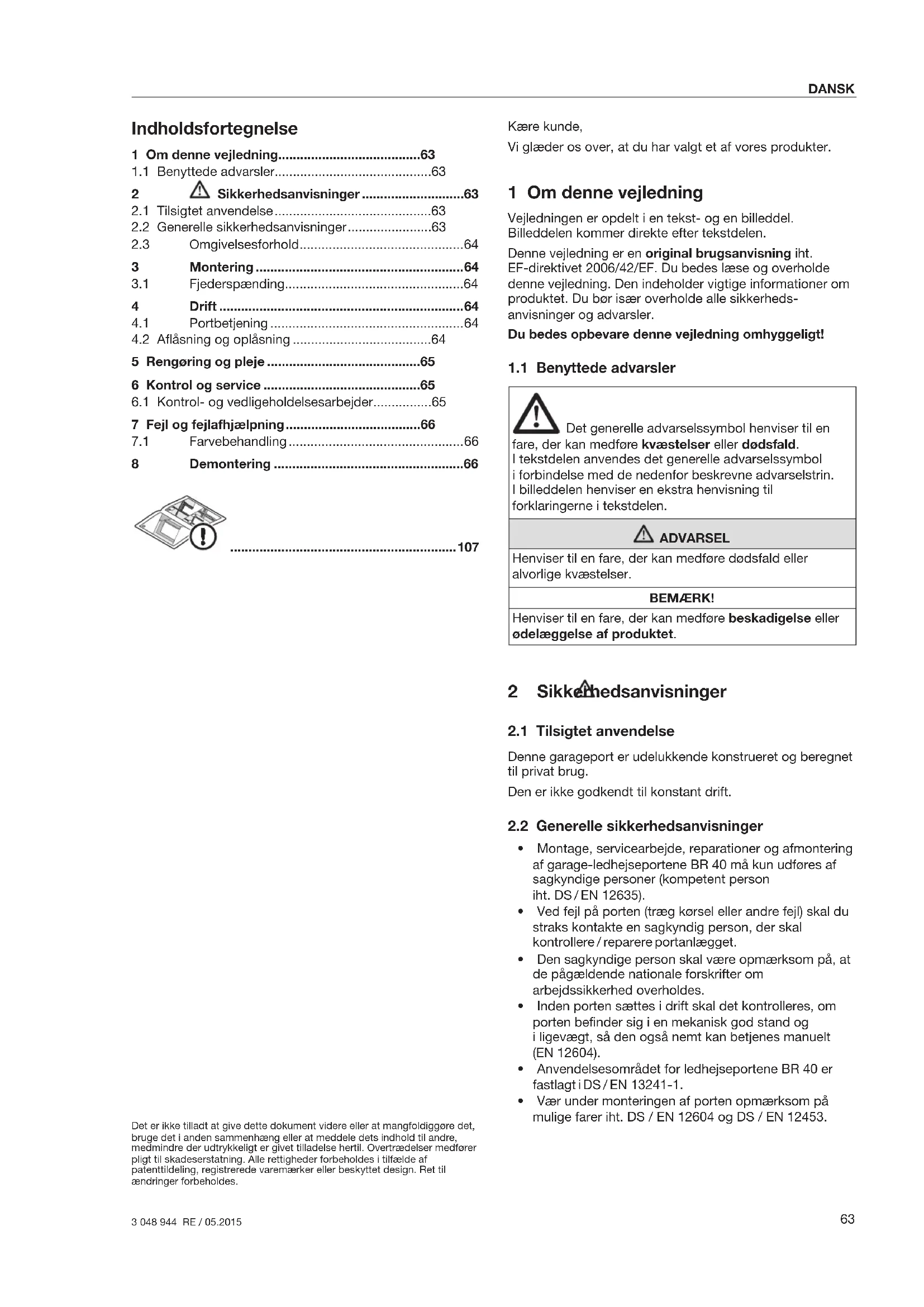 - Vær under monteringen af porten opmærksom på mulige farer iht. DS / EN12604 og DS / EN12453. 1 Om denne vejledning.......................................63
