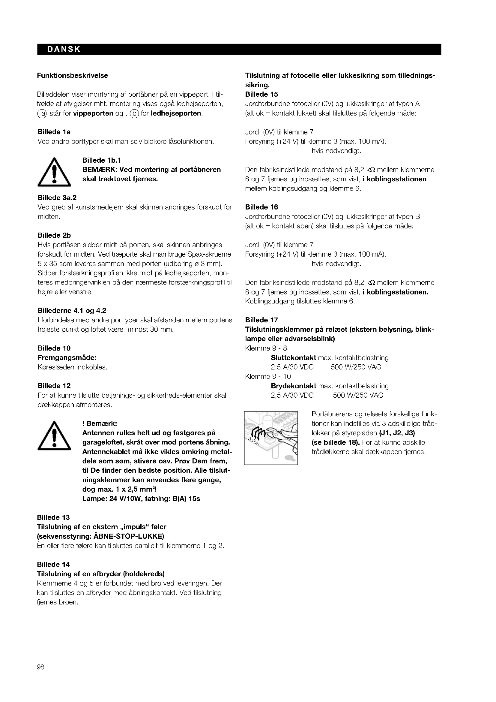 Lampe: 24 V/10W, fatning: B(A) 15s Billede 13 Tilslutning af en ekstern „impuls“ føler (sekvensstyring: ÅBNE-STOP-LUKKE) Èn eller flere følere kan tilsluttes parallelt til klemmerne 1 og 2. Billede 14 Tilslutning af en afbryder (holdekreds) Klemmerne 4 og 5 er forbundet med bro ved leveringen. Der kan tilsluttes en afbryder med åbningskontakt. Ved tilslutning fjernes broen. Tilslutning af fotocelle eller lukkesikring som tillednings- sikring. Billede 15 Jordforbundne fotoceller (0V) og lukkesikringer af typen A (alt ok = kontakt lukket) skal tilsluttes på følgende måde: Jord (0V) til klemme 7 Forsyning (+24 V) til klemme 3 (max. 100 mA), hvis nødvendigt. Den fabriksindstillede modstand på 8,2 kΩ mellem klemmerne 6 og 7 fjernes og indsættes, som vist, i koblingsstationen mellem koblingsudgang og klemme 6. Billede 16 Jordforbundne fotoceller (0V) og lukkesikringer af typen B (alt ok = kontakt åben) skal tilsluttes på følgende måde: Jord (0V) til klemme 7 Forsyning (+24 V) til klemme 3 (max. 100 mA), hvis nødvendigt. Den fabriksindstillede modstand på 8,2 kΩ mellem klemmerne 6 og 7 fjernes og indsættes, som vist, i koblingsstationen. Koblingsudgang tilsluttes klemme 6. Billede 17 Tilslutningsklemmer på relæet (ekstern belysning, blink- lampe eller advarselsblink) Klemme 9 - 8 Sluttekontakt max. kontaktbelastning