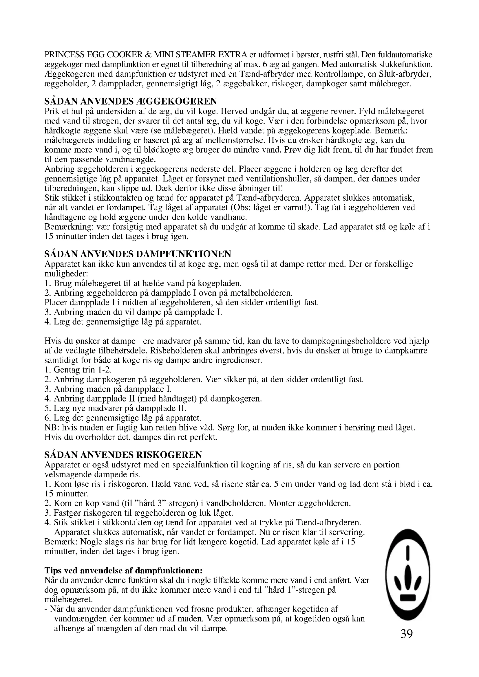 Mad Vægt Antal Mængde af vand Mængde af vand (hvis koldt) (hvis frosset) store stykker kød ca. 135 gram 2 hard 1 x alm. stykker kød ca. 65 gram 2 hard 6 – medium 2 hard 1 – hard 2 små stykker kød ca. 35 gram 3 medium 2 hard 3 – hard 4 dim sum ca. 25 gram 8 hard 6 – medium 2 hard 5 – hard 6 Brug forkogte nudler og dim sum. RENGØRING TAG ALTID FØRST STIKKET UD AF STIKKONTAKTEN! RENGØR FØRST APPARATET NÅR DET ER KØLET HELT AF! Soklens yderside kan rengøres med en fugtig klud (må aldrig kommes ned i vand eller andre væsker). Tilbehørsdelene kan tørres af med en fugtig klud. Ifald det måtte være nødvendigt, kan de også rengøres i varmt sæbevand. Fjern – hver gang apparatet har været i brug – kalken fra kogepladen. Hvis kalklaget bliver for tykt, kan kogepladen fyldes med en blanding af 50% vand og 50% eddike, men anbring da ikke æggeholderen og låget på apparatet. Stik stikket i stikkontakten og lad blandingen koge i et par minutter. Gentag dette et par gange. Rengør derefter kogepladen grundigt med vand. PRINCESS-TIPS - Kom aldrig apparatets sokkel ned i vand eller andre væsker. - Tag altid stikket ud af stikkontakten inden rengøring eller ved defekter. - Dæk aldrig dampåbningerne i låget til. - Vær opmærksom på, at der dannes damp under låget, og at denne slipper ud gennem dampåbningerne. - Under dampningen bliver låget meget varmt, åbn ikke låget, inden du er færdig. - Forsikr dig om, at apparatet er kølet helt af, inden du flytter det. - Lad apparatet stå og køle af i 15 minutter, inden det tages i brug igen. - Indersiden og de forskellige tilbehørsdele bliver meget varme: sørg for, at børn ikke kommer til dem og vær også selv forsigtig. - Sørg for, at apparatet ikke er anbragt på kanten af et bord eller køkkenbord, så man kan komme til at vælte det ned på gulvet; sørg også for at ledningen ikke er anbragt således, at man kan falde over den eller blive hængende i den. - Ved beskadigelse af apparatet eller dets ledning, bør dette ikke anvendes mere men sendes til vores tekniske afdeling. - Anbring ikke apparatet på eller i nærheden af en varm kogeplade eller lignende. - Tilslut kun apparatet til en jordforbunden stikkontakt. - Dette apparat er kun egnet til husholdningsbrug. - Hold opsyn med børn, så man er sikker på, at de ikke bruger apparatet som legetøj. - Det kan være farligt at lade børn eller personer med et mentalt eller fysisk handicap eller uden den nødvendige erfaring eller viden anvende apparatet. Den, der har ansvaret for deres sikkerhed, bør først instruere dem i brugen heraf eller altid selv holde tilsyn, når apparatet er i brug. OPSKRIFTER DAMPEDE “POCHEREDE” ÆG MED PØLSER OG ASPARGES (1 PORTION) 1 æg (slået ud i en mindre aluminiumbakke) 1-2 asparges 2-3 hotdogpølser salt og peber efter smag41 TILBEREDNING: