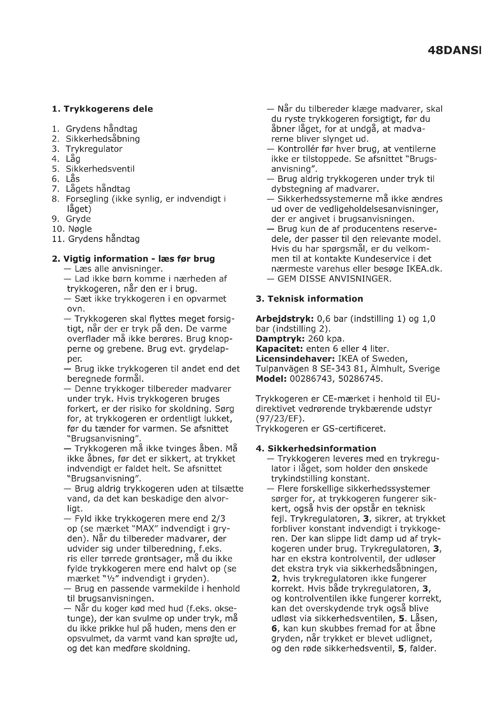 — Læs alle anvisninger. — Lad ikke børn komme i nærheden af trykkogeren, når den er i brug. — Sæt ikke trykkogeren i en opvarmet ovn. — Trykkogeren skal yttes meget forsig- tigt, når der er tryk på den. De varme overader må ikke berøres. Brug knop- perne og grebene. Brug evt. grydelap- per. — Brug ikke trykkogeren til andet end det beregnede formål. — Denne trykkoger tilbereder madvarer under tryk. Hvis trykkogeren bruges forkert, er der risiko for skoldning. Sørg for, at trykkogeren er ordentligt lukket, før du tænder for varmen. Se afsnittet “Brugsanvisning”. — Trykkogeren må ikke tvinges åben. Må ikke åbnes, før det er sikkert, at trykket indvendigt er faldet helt. Se afsnittet “Brugsanvisning”. — Brug aldrig trykkogeren uden at tilsætte vand, da det kan beskadige den alvor- ligt. — Fyld ikke trykkogeren mere end 2/3 op (se mærket “MAX” indvendigt i gry- den). Når du tilbereder madvarer, der udvider sig under tilberedning, f.eks. ris eller tørrede grøntsager, må du ikke fylde trykkogeren mere end halvt op (se mærket “½” indvendigt i gryden). — Brug en passende varmekilde i henhold til brugsanvisningen. — Når du koger kød med hud (f.eks. okse- tunge), der kan svulme op under tryk, må du ikke prikke hul på huden, mens den er opsvulmet, da varmt vand kan sprøjte ud, og det kan medføre skoldning. — Når du tilbereder klæge madvarer, skal du ryste trykkogeren forsigtigt, før du åbner låget, for at undgå, at madva- rerne bliver slynget ud. — Kontrollér før hver brug, at ventilerne ikke er tilstoppede. Se afsnittet “Brugs- anvisning”. — Brug aldrig trykkogeren under tryk til dybstegning af madvarer. — Sikkerhedssystemerne må ikke ændres ud over de vedligeholdelsesanvisninger, der er angivet i brugsanvisningen. — Brug kun de af producentens reserve- dele, der passer til den relevante model. Hvis du har spørgsmål, er du velkom- men til at kontakte Kundeservice i det nærmeste varehus eller besøge IKEA.dk. — GEM DISSE ANVISNINGER.