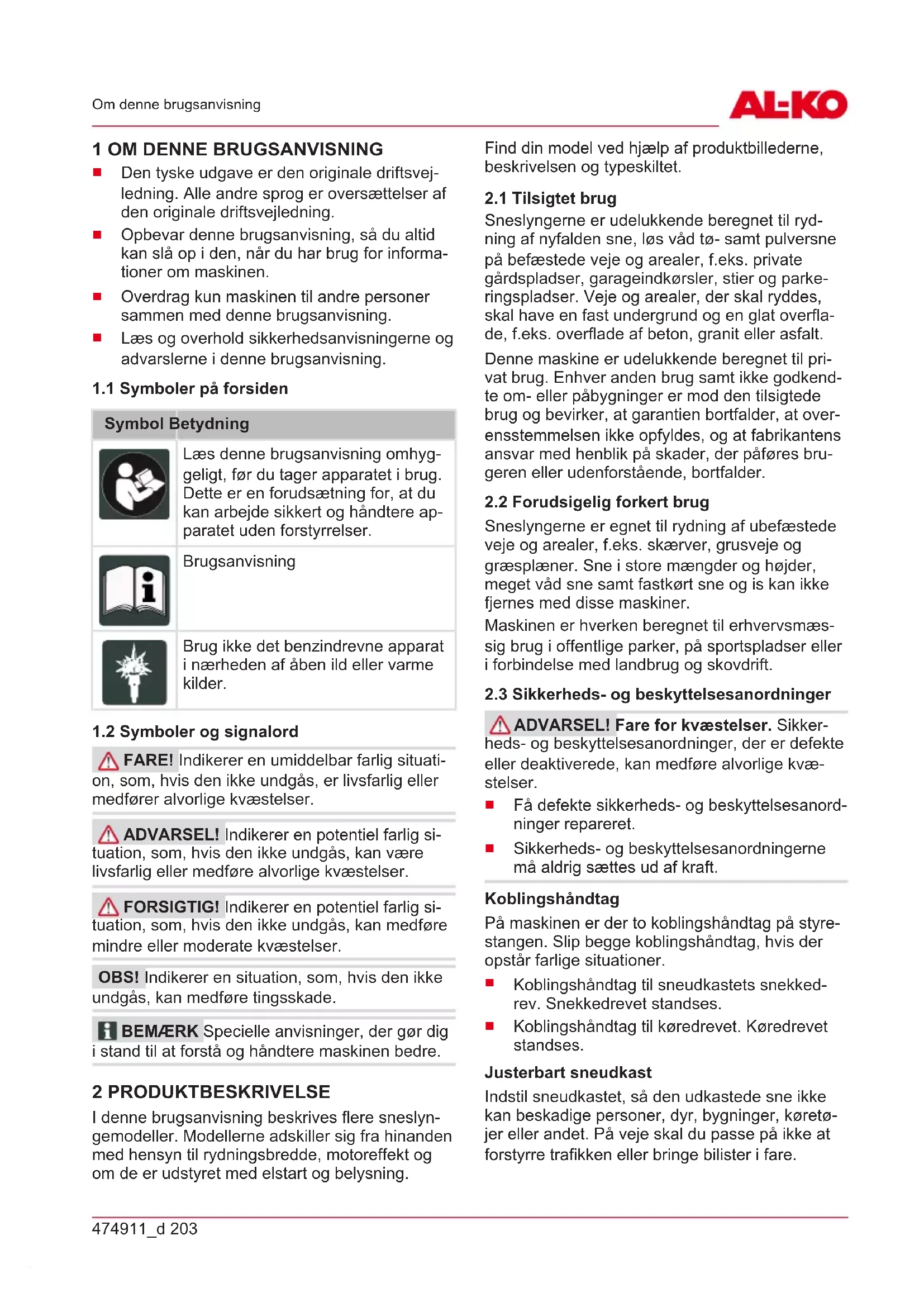 FARE! Indikerer en umiddelbar farlig situati- on, som, hvis den ikke undgås, er livsfarlig eller medfører alvorlige kvæstelser. ADVARSEL! Indikerer en potentiel farlig si- tuation, som, hvis den ikke undgås, kan være livsfarlig eller medføre alvorlige kvæstelser. FORSIGTIG! Indikerer en potentiel farlig si- tuation, som, hvis den ikke undgås, kan medføre mindre eller moderate kvæstelser. OBS! Indikerer en situation, som, hvis den ikke undgås, kan medføre tingsskade. BEMÆRK Specielle anvisninger, der gør dig i stand til at forstå og håndtere maskinen bedre. 2 PRODUKTBESKRIVELSE I denne brugsanvisning beskrives flere sneslyn- gemodeller. Modellerne adskiller sig fra hinanden med hensyn til rydningsbredde, motoreffekt og om de er udstyret med elstart og belysning. Find din model ved hjælp af produktbillederne, beskrivelsen og typeskiltet.