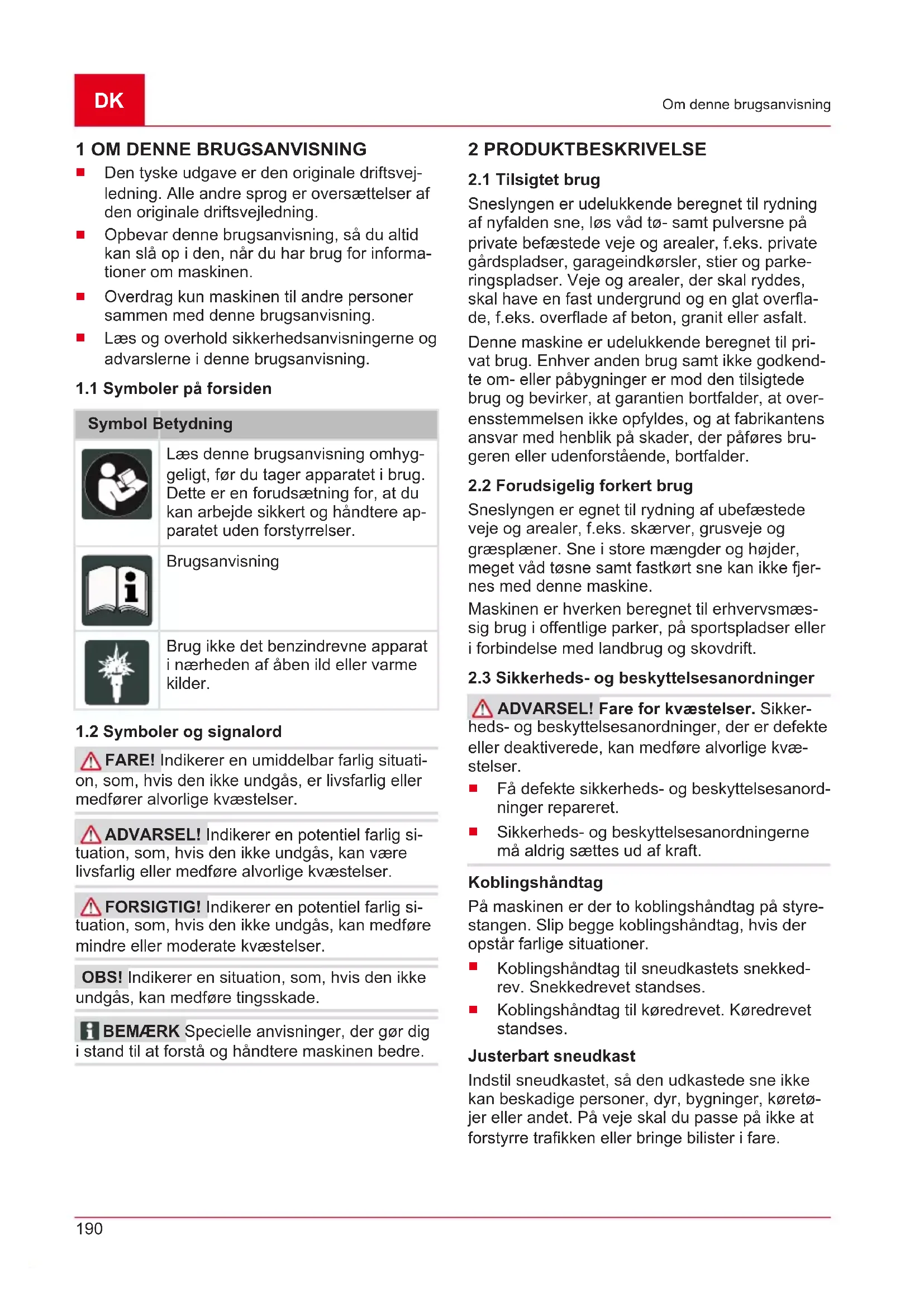Produktoversigten (01) giver et overblik over ma- skinen. Nr. Del 1 Opvarmede håndtag 2 Knap til belysning 3 Knap til håndtagenes varme 4 Ekstra knækbolte 5 Koblingsdrev til snekkedrevet 6 Håndtag til styring af udkasthøjden 7 Gearskifter, 6 fremadgående gear og 2 bakgear 8 Koblingshåndtag til køredrevet 9 Deflektor på sneudkastet til indstilling af udkasthøjden 10 Sneudkast med håndbeskyttelse 11 Belysning 12 Håndsving til justering af udkastretnin- gen 13 Tankdæksel 14 Oliepåfyldningsdæksel 15 Skjold 16 Rengøringsværktøj (fastgjort på skjol- det) 17 Tændrørsstik 18 Transportsnekke469370_d 193 Sikkerhedsanvisninger Nr. Del 19 Kastehjul 20 Ryddeplade 21 Højdejusterbare glideskinner 3 SIKKERHEDSANVISNINGER FARE! Livsfare samt fare for alvorlige kvæstelser! Manglende kendskab til sikkerheds- anvisningerne og betjeningsanvisningerne kan medføre meget alvorlige kvæstelser samt være livsfarlige.