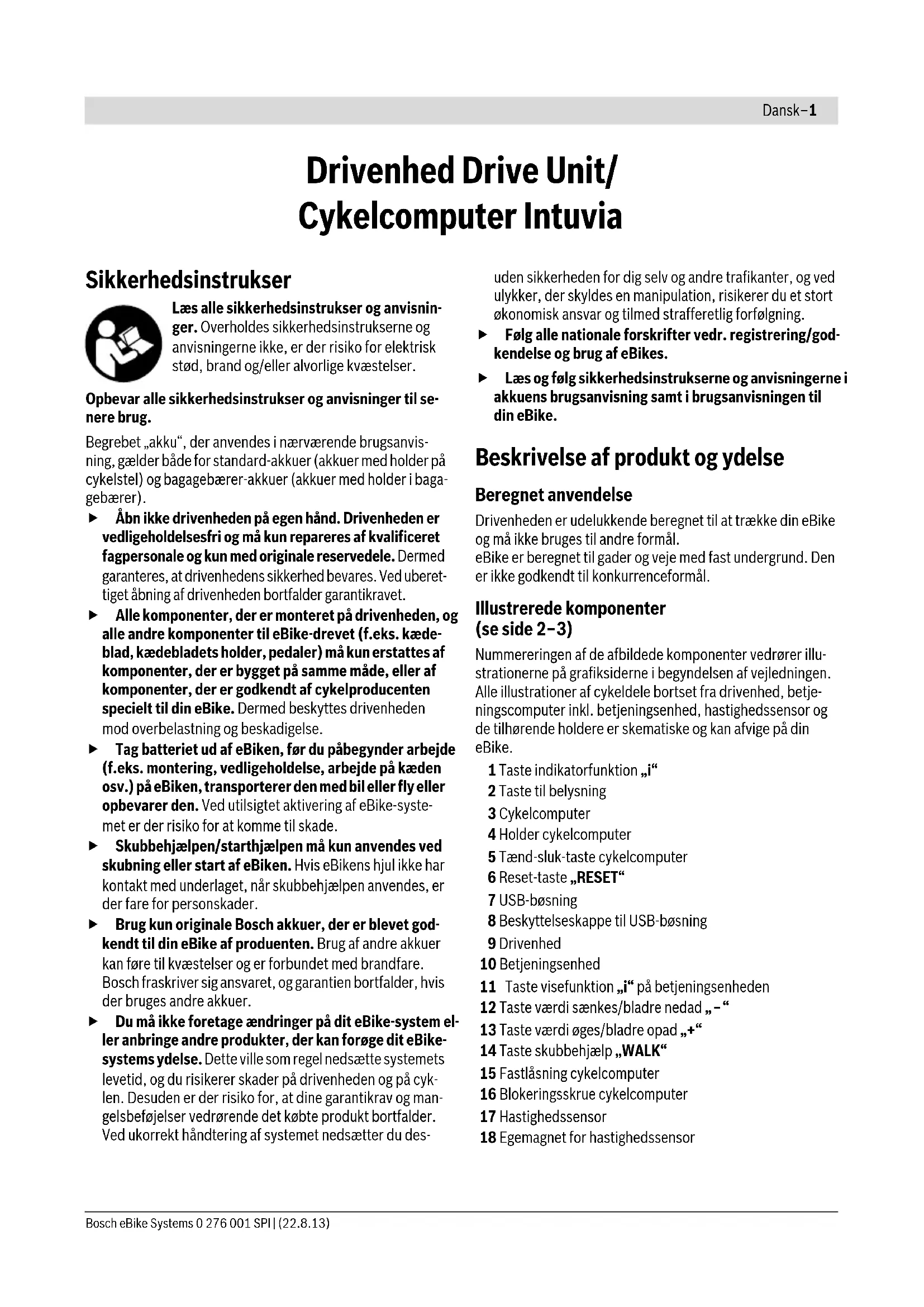 Alle komponenter, der er monteret på drivenheden, og alle andre komponenter til eBike-drevet (f.eks. kædeblad, kædebladets holder, pedaler) på kun erstattes af komponenter, der er bygget på samme på, eller af komponenter, der er godkendt auf cykelproducenten specielt til din eBike. Dermen beskyttes drivenheden mod overbelastning og beskadigelse.