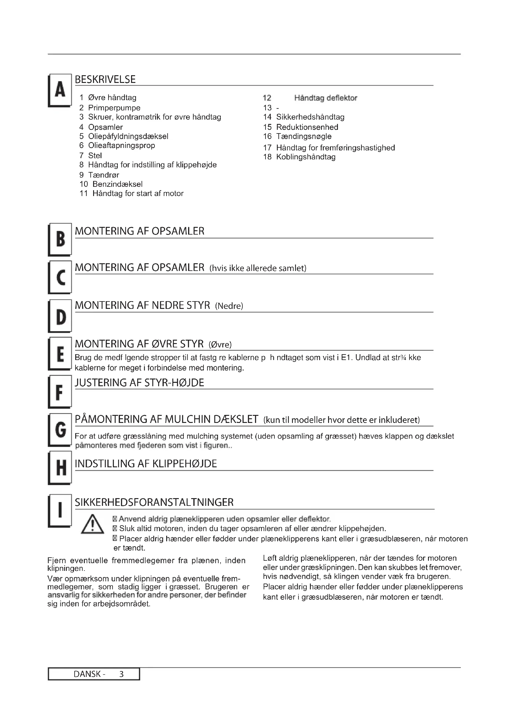 Forsigtig! Læs vejledningen igennem inden ibrug- tagning Hold uvedkommende personer på sikker afstand af farezonen! Forsigtig: Fare for tilføjelse af sår på hænder og fødder. Fare for indånding af giftige gasser! Anvend andrig maskinen i lukkede eller dårligt ventilerede rum. Eksplosionsfare! Fyld aldrig brændstof på med motoren tændt Forsigtig! Forsigtig! Enhver form for vedligeholdelse skal ske med slukket motor og frakoblet tændrør. Vi takker dig for at have valgt en af vores plæneklippere. Vi er overbeviste om, at maskinens høje kvalitet og præsta- tioner vil tilfredsstille dine forventninger og klippe din plæne lang tid fremover. Læs vejledningen grundigt igennem, da den indeholder vigtige råd til en korrekt anvendelse i overensstemmelse med de vigtigste sikkerhedskrav. 1 Fabrikant 2 Model 3 Produktnummer 4 ML-nummer 5 Serienummer 6 Type 7 Motor info 8 Vægt 9 LydeffektniveauDANSK - SIKKERHEDSNORMER