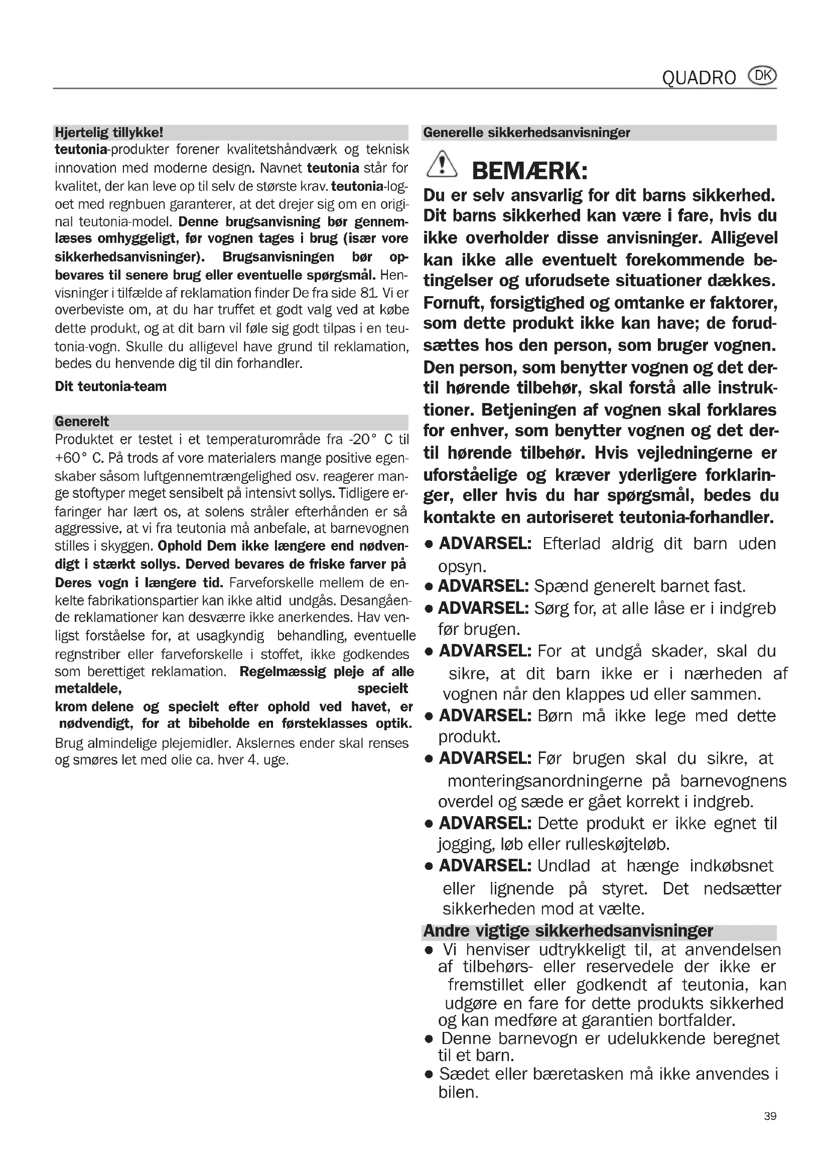 Vi er overbeviste om, at du har truffet et godt valg ved at købe dette produkt, og at dit barn vil føle sig godt tilpas i en teu- tonia-vogn. Skulle du alligevel have grund til reklamation, bedes du henvende dig til din forhandler. Dit teutonia-team Generelt Produktet er testet i et temperaturområde fra -20° C til +60° C. På trods af vore materialers mange positive egen- skaber såsom luftgennemtrængelighed osv. reagerer man- ge stoftyper meget sensibelt på intensivt sollys. Tidligere er- faringer har lært os, at solens stråler efterhånden er så aggressive, at vi fra teutonia må anbefale, at barnevognen stilles i skyggen. Ophold Dem ikke længere end nødven- digt i stærkt sollys. Derved bevares de friske farver på Deres vogn i længere tid. Farveforskelle mellem de en- kelte fabrikationspartier kan ikke altid undgås. Desangåen- de reklamationer kan desværre ikke anerkendes. Hav ven- ligst forståelse for, at usagkyndig behandling, eventuelle regnstriber eller farveforskelle i stoffet, ikke godkendes som berettiget reklamation. Regelmæssig pleje af alle metaldele, specielt krom delene og specielt efter ophold ved havet, er nødvendigt, for at bibeholde en førsteklasses optik. Brug almindelige plejemidler. Akslernes ender skal renses og smøres let med olie ca. hver 4. uge. Quadro_in_mistral_s_08_in.qxd 12.10.11 13:38 Seite 39QUADRO