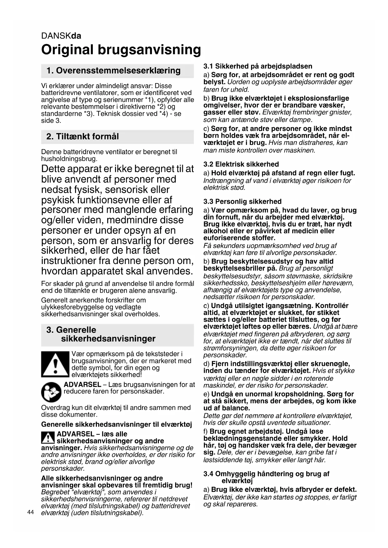 Vi erklærer under almindeligt ansvar: Disse batteridrevne ventilatorer, som er identificeret ved angivelse af type og serienummer *1), opfylder alle relevante bestemmelier i direktiverne *2) og standarderne *3). Teknisk dossier ved *4)- se side 3.