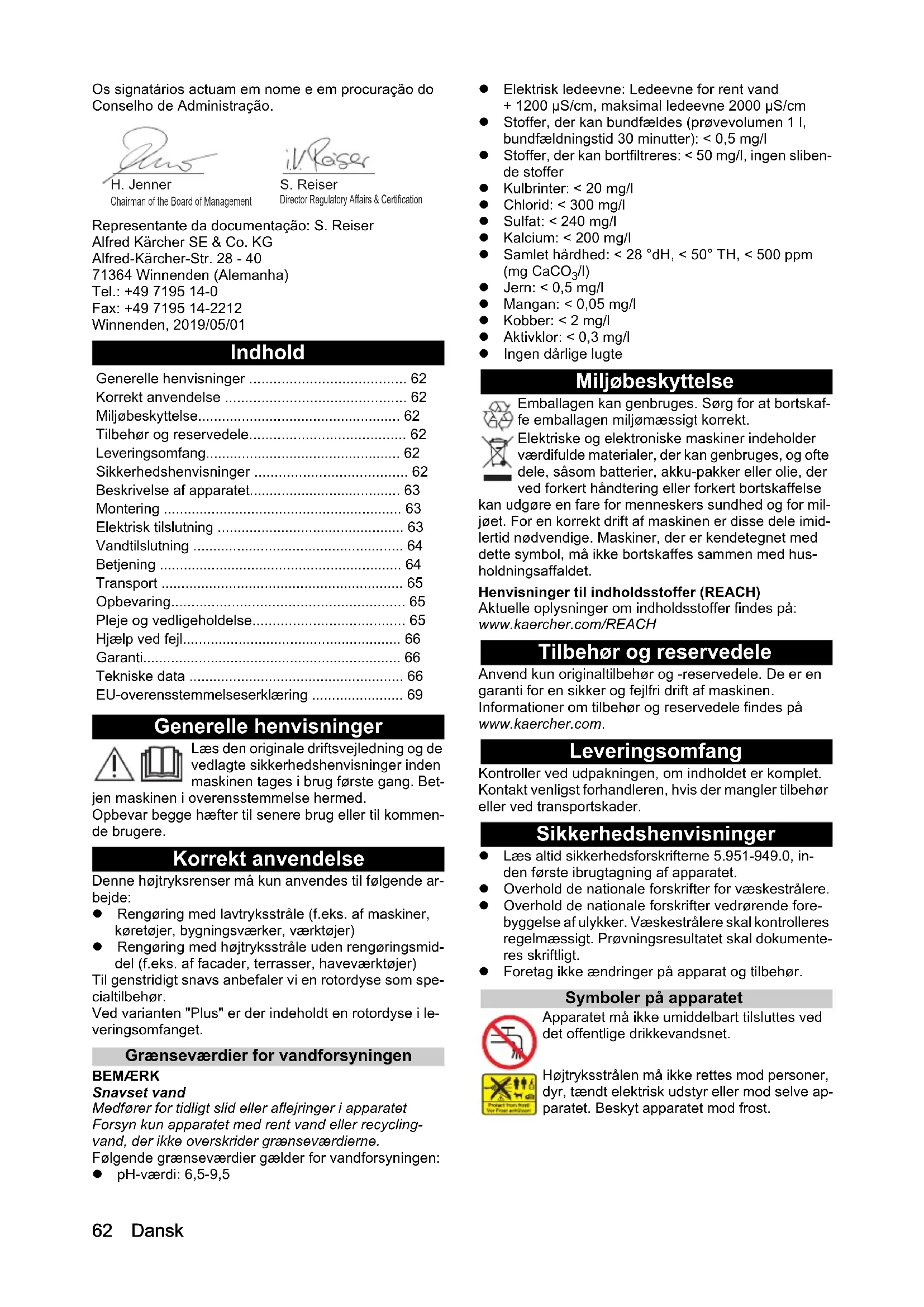 HD 6/13 C62 Dansk Os signatários actuam em nome e em procuração do Conselho de Administração. Representante da documentação: S. Reiser Alfred Kärcher SE & Co. KG Alfred-Kärcher-Str. 28 - 40 71364 Winnenden (Alemanha) Tel.: +49 7195 14-0 Fax: +49 7195 14-2212 Winnenden, 2019/05/01 Indhold Generelle henvisninger Læs den originale driftsvejledning og de vedlagte sikkerhedshenvisninger inden maskinen tages i brug første gang. Bet- jen maskinen i overensstemmelse hermed. Opbevar begge hæfter til senere brug eller til kommen- de brugere. Korrekt anvendelse Denne højtryksrenser må kun anvendes til følgende ar- bejde: Rengøring med lavtryksstråle (f.eks. af maskiner, køretøjer, bygningsværker, værktøjer) Rengøring med højtryksstråle uden rengøringsmid- del (f.eks. af facader, terrasser, haveværktøjer) Til genstridigt snavs anbefaler vi en rotordyse som spe- cialtilbehør. Ved varianten "Plus" er der indeholdt en rotordyse i le- veringsomfanget. Grænseværdier for vandforsyningen BEMÆRK Snavset vand Medfører for tidligt slid eller aflejringer i apparatet Forsyn kun apparatet med rent vand eller recycling- vand, der ikke overskrider grænseværdierne. Følgende grænseværdier gælder for vandforsyningen: pH-værdi: 6,5-9,5 Elektrisk ledeevne: Ledeevne for rent vand + 1200 µS/cm, maksimal ledeevne 2000 µS/cm Stoffer, der kan bundfældes (prøvevolumen 1 l, bundfældningstid 30 minutter): < 0,5 mg/l Stoffer, der kan bortfiltreres: < 50 mg/l, ingen sliben- de stoffer Kulbrinter: < 20 mg/l Chlorid: < 300 mg/l Sulfat: < 240 mg/l Kalcium: < 200 mg/l Samlet hårdhed: < 28 °dH, < 50° TH, < 500 ppm (mg CaCO