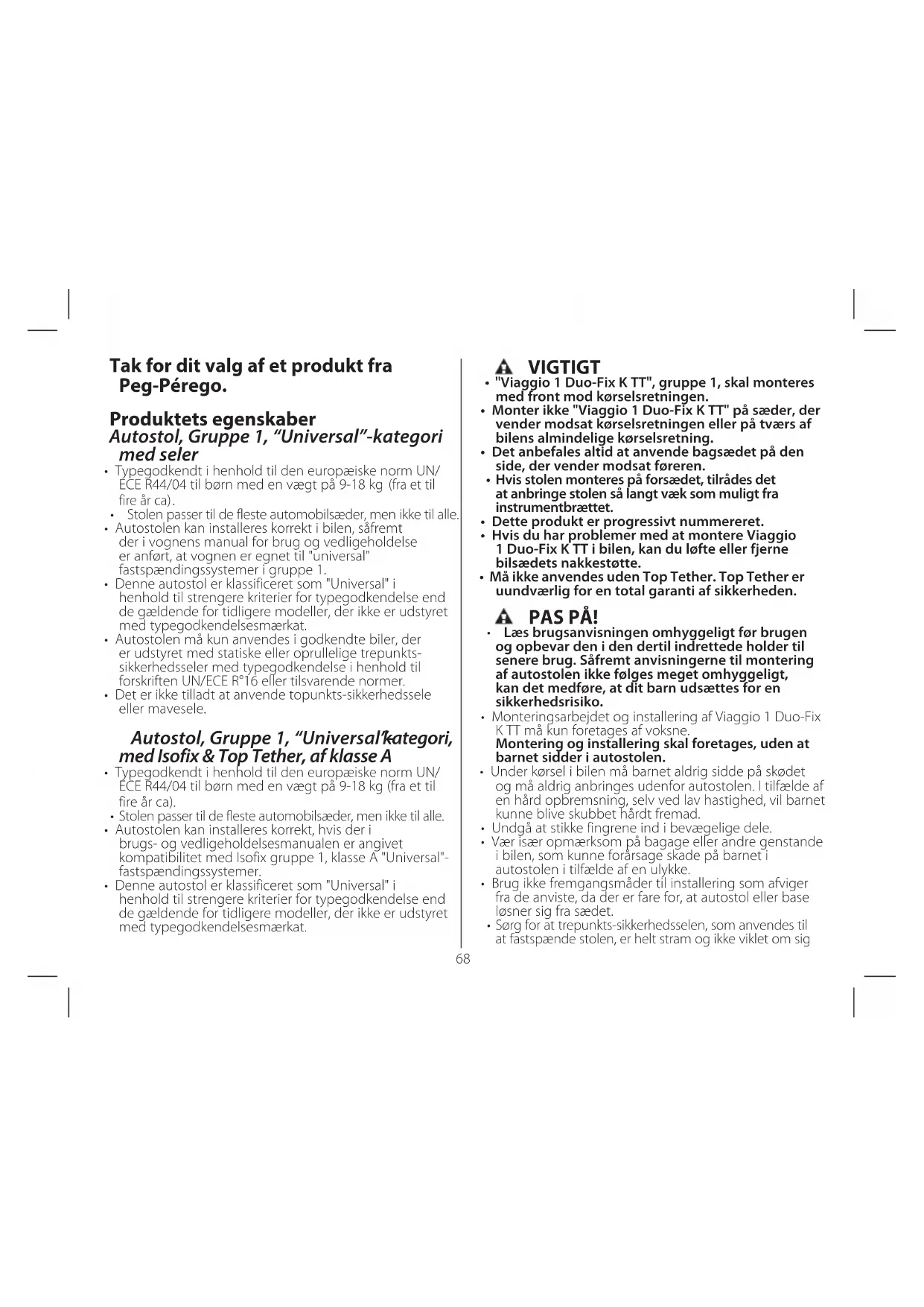Læs grundigt for en korrekt brug af den nye PegPerego autostol: Viaggio 1 Duo-Fix K TT. Viaggio 1 Duo-Fix K TT er den nye PegPerego autostol til børn på mellem 9 og 18 kg, og godkendt ifølge den europæiske lovbestemmelse R44/04 . Viaggio 1 Duo-Fix K TT anvender ISOFIX låseanordningen med Top Tether i overensstemmelse med den seneste opdatering af de europæiske lovbestemmelser, som sikrer den største sikkerhed og pålidelighed. Alle nyere køretøjer er ved lov forsynet med ISOFIX sammenkoblinger, som er placeret på sammenføjningen mellem bilens ryglæn og sæde, såvel som med tilslutning til TOP TETHER. Normalt er denne placeret på hattehylden bag bagsæderne i personbiler (foto A), eller bag det bageste sæde i varebiler (foto B), eller også i bagagerummet i MPV'er eller SUV'er/firehjulstrækkere (foto C): For at undgå at anvende et spænde som ikke er BA C68 Tak for dit valg af et produkt fra Peg-Pérego. Produktets egenskaber Autostol, Gruppe 1, “Universal”-kategori med seler