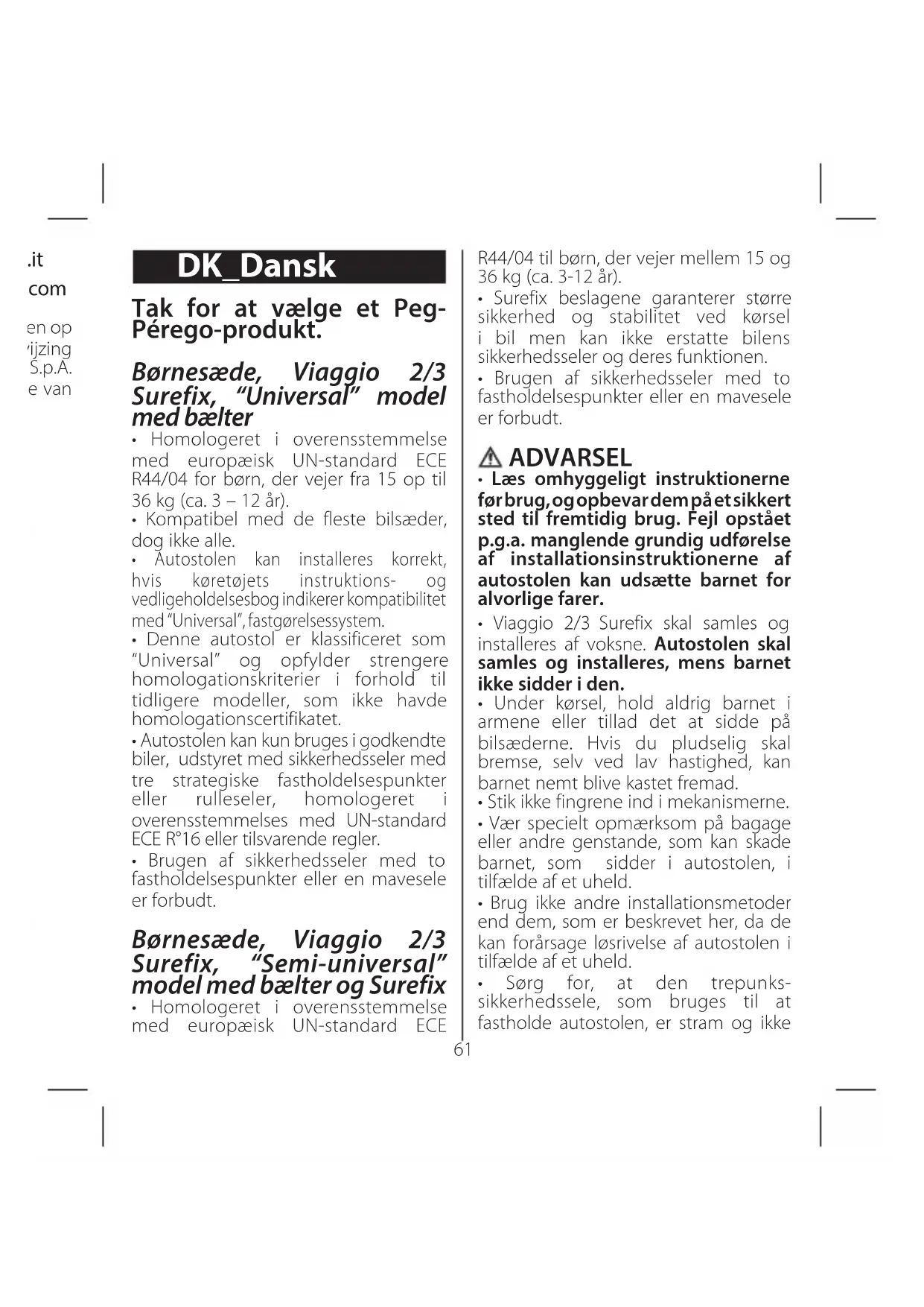 - Homologeret i overensstemmelse med europæisk UN-standard ECE61 e-mail assistenza@pegperego.it site internet www.pegperego.com Alle intellectuele eigendomsrechten op de inhoud van deze gebruiksaanwijzing zijn eigendom van PEG PEREGO S.p.A. en worden beschermd volgens de van toepassing zijnde wetten. DK_Dansk Tak for at vælge et Peg- Pérego-produkt. Børnesæde, Viaggio 2/3 Surefix, “Universal” model med bælter