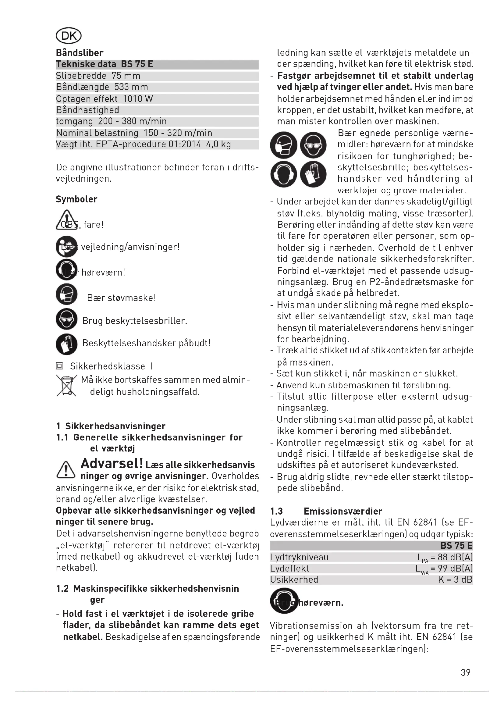 = 6,0 m/s² K = 2,0 m/s² De angivne emissionsværdier (vibration, støj) - bruges til sammenligning af maskiner, - men kan også bruges til en foreløbig bedøm- melse af vibrations- og støjbelastningen ved brug. - repræsenterer de vigtigste anvendelsesformål for elværktøjet. FORSIGTIG Støjemissionerne under den faktiske brug af el‑værktøjet kan afvige fra de angivne værdier, alt efter hvordan el- værktøjet anvendes, især hvilken type emner der bearbejdes. Træf sikkerhedsforanstaltninger, der beskytter brugeren på grundlag af en vur- dering af eksponeringen under faktiske brugsforhold. (Der skal her tages hensyn til alle driftscyklussens dele, f.eks. tids- punkter, hvor el-værktøjet er slukket og tidspunkter, hvor el-værktøjet er tændt, men kører uden belastning.) 2 Bestemmelsesmæssig brug Universelt anvendelig slibemaskine til slibning af træemner, kunststoffer og byggemateriale; under anvendelse af tilsvarende slibebånd til grov- og finslibning af flader, kanter, lister og false. Med type BS 75 E - Set ved anvendelse af børste- sliberamme til slibning af emneoverflader som finer osv. Metal og asbestholdige materialer må ikke bear- bejdes. Ved bearbejdning af metal kan der flyve gnister, som øger risikoen for brand. Betjening og anvendelse kan udvides ved hjælp af det tilbudte tilbehør. De almindeligt anerkendte forskrifter for ulyk- keforebyggelse og de vedlagte »Sikkerhedsan- visninger« for arbejde med elektroværktøjer skal overholdes. Ændringer, som brugeren selv har foretaget, samt anbringelse af fremmed tilbehør på maskinen udelukker fabrikantens ansvar for deraf følgende skader. For skader og ulykker, som måtte opstå ved ikke formålsbestemt brug, er bruge- ren ansvarlig! 3 Tilslutning til nettet Netspændingen skal stemme overens med spændingen på effektskiltet! Sikering ved 230 V: 10 A Tilslutning er også mulig ved brug af stikkontakt uden sikrings-afbryder, da der forefindes sikkerhedsisolering (klasse II). Tilslutning er også mulig ved brug af stikkontakt uden sikringsafbryder, da der forefindes sikker- hedsisolering (klasse II). Benyt kun forlængerledning med et tværsnits areal på 3 x 1,5 mm
