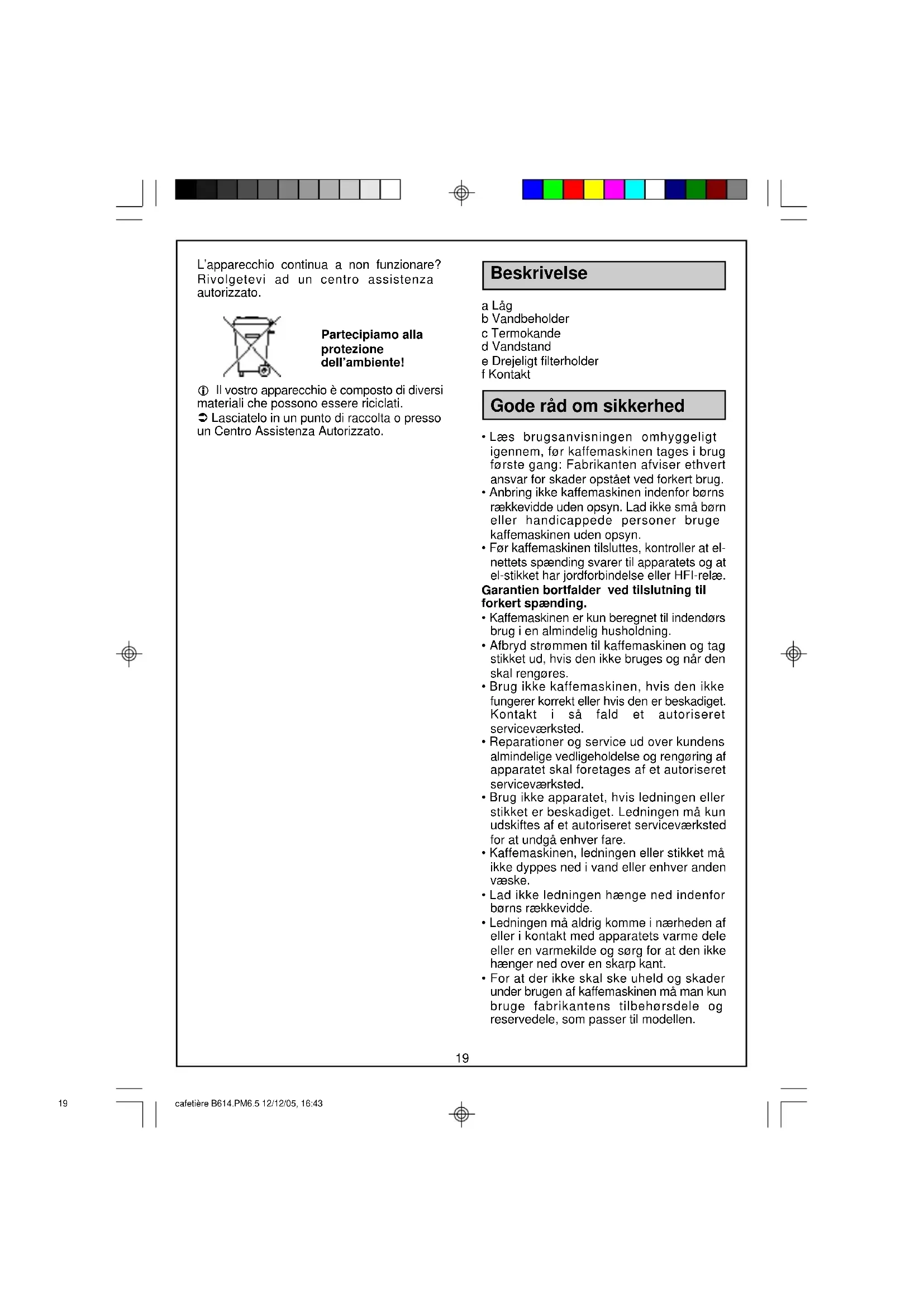 - For at der ikke skal ske uheld og skader under brugen af kaffemaskinen må man kun bruge fabrikantens tilbehørsdele og reservedele, som passer til modellen. cafetière B614.PM6.5 12/12/05, 16:431920