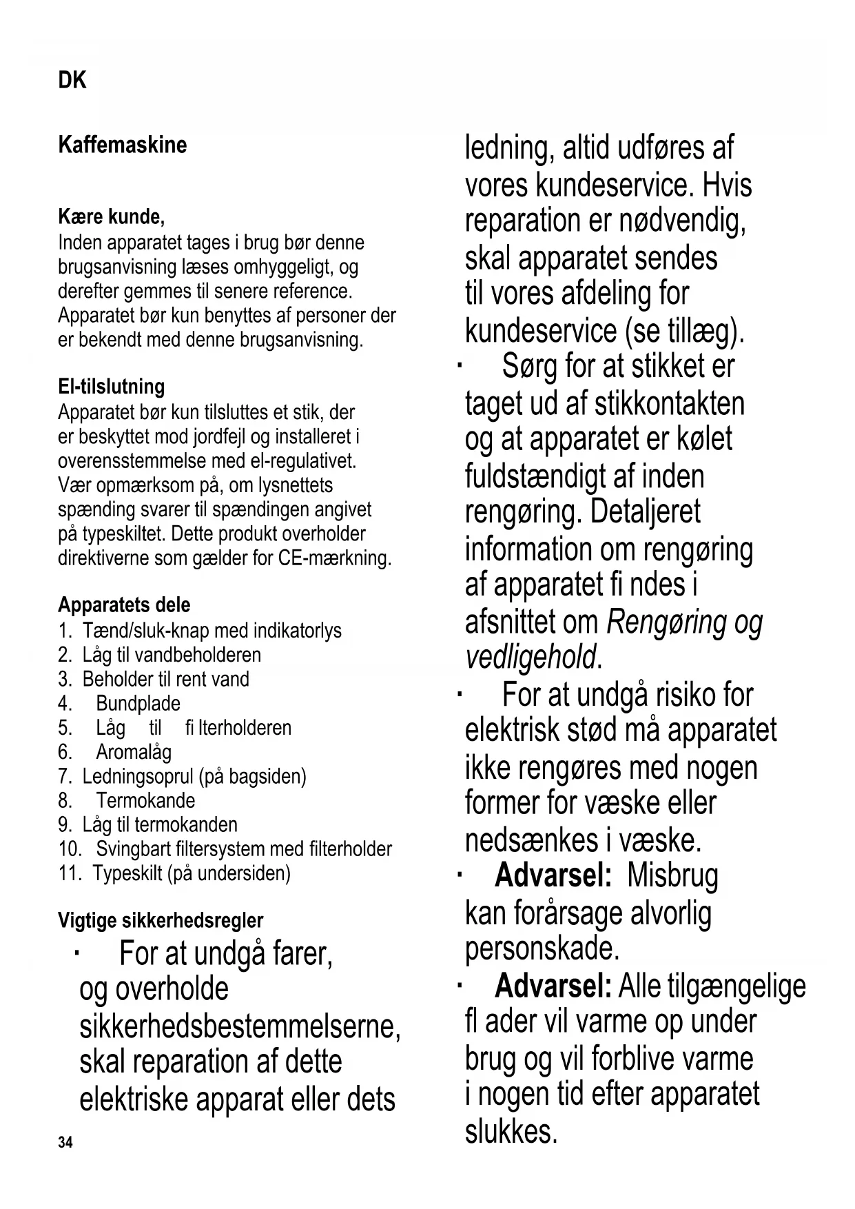 Vigtige sikkerhedsregler ∙ For at undgå farer, og overholde sikkerhedsbestemmelserne, skal reparation af dette elektriske apparat eller dets ledning, altid udføres af vores kundeservice. Hvis reparation er nødvendig, skal apparatet sendes til vores afdeling for kundeservice (se tillæg). ∙ Sørg for at stikket er taget ud af stikkontakten og at apparatet er kølet fuldstændigt af inden rengøring. Detaljeret information om rengøring af apparatet fi ndes i afsnittet om Rengøring og vedligehold. ∙ For at undgå risiko for elektrisk stød må apparatet ikke rengøres med nogen former for væske eller nedsænkes i væske. ∙ Advarsel: Misbrug kan forårsage alvorlig personskade. ∙ Advarsel: Alle tilgængelige fl ader vil varme op under brug og vil forblive varme i nogen tid efter apparatet slukkes. DK35 ∙ Dette apparat er beregnet til privat brug eller i tilsvarende omgivelser, såsom - i tekøkkener, kontorer eller andre mindre virksomheder, - landbrugsvirksomheder, - af kunder på hoteller, moteller m.m. og tilsvarende foretagender, - B&B pensionater. ∙ Dette apparat kan benyttes af børn (som er mindst 8 år) og af personer med reducerede fysiske, sensoriske eller mentale evner, eller mangel på erfaring eller viden, såfremt de har fået vejledning og instruktion i brugen af dette apparat og fuldt ud forstår alle farer og forholdsregler vedrørende sikkerheden som brug af apparatet medfører. ∙ Børn må aldrig få lov til at lege med apparatet. ∙ Børn må aldrig få lov til at udføre rengørings- eller vedligeholdelsesarbejde på dette apparat, medmindre de er under opsyn og mindst 8 år gamle. ∙ Apparatet og dets ledning må altid holdes væk fra børn som er yngre en 8 år. ∙ Advarsel: Hold børn væk fra emballeringen, da denne udgør en mulig risiko for tilskadekomst, ved f.eks. kvælning. ∙ Inden apparatet benyttes må både apparatet og dets tilbehør ses grundigt efter for fejl. Hvis apparatet for eksempel har været tabt på en hård overfl ade eller der er blevet trukket i ledningen med stor kraft, må det ikke længere benyttes: Selv skader der ikke er synlige kan have ugunstig indvirkning på sikkerheden ved brug af apparatet. ∙ Under brug skal kaffemaskinen placeres på en plan, skridfast overfl ade der kan tåle vandstænk og pletter. ∙ Lad aldrig apparatet eller dets ledning berøre eller komme i kontakt med varme overfl ader eller andre varmekilder. ∙ Efterlad ikke tilsluttede apparater uden opsyn. ∙ For at undgå risikoen for at varmt vand eller damp skal slippe ud, skal man altid slukke for kaffemaskinen og lade den få tilstrækkelig tid til at køle af inden tragten åbnes eller nogen af delene eller tilbehøret tages af. ∙ Tag altid stikket ud af stikkontakten36 - i tilfælde af fejlfunktion, - efter brug, - og inden rengøring af apparatet. ∙ Træk aldrig i selve ledningen, når ledningen tages ud af stikkontakten; tag altid fat i selve stikket. ∙ Lad aldrig ledningen hænge frit; ledningen skal altid holdes langt væk fra apparatets varme dele. ∙ Vi påtager os intet ansvar for skader, der skyldes misbrug eller manglende overholdelse af denne brugsanvisning. ∙ Advarsel: Vandbeholderen varmes op under brug. Før brug ∙ Inden der første gang brygges kaffe på maskinen, bør den skylles igennem med to til tre hold vand fyldt op til det anviste maksimum, men uden brug af kaffe. Dette bør ligeledes gentages hvis maskinen ikke har været brugt igennem længere tid, og efter afkalkning. Kaffebrygning ∙ Åbn det svingbare fi ltersystem og tag fi lterholderens låg af. ∙ Indsæt et papirkaffefi lter str. 4 i fi lterholderen, hvor fi lterets perforerede kant først er foldet ind. ∙ Vi anbefaler brug af fi ntmalet kaffe: ∙ til kopper af normal størrelse benyttes ca. 6 g (= 2 tsk.) malet kaffe; ∙ til mindre kopper benyttes ca. 4g (= 1½ tsk.) ∙ Den aktuelle mængde som benyttes kan ændres alt efter personlig smag. ∙ Sæt låget på fi lterholderen igen og luk det svingbare fi ltersystem. ∙ Åbn låget til vandbeholderen og fyld den med den ønskede mængde koldt vand, under hensyntagen til mindste påfyldningsmængde (2 kopper). ∙ To måleinddelinger på ventilenheden hjælper med til at fi nde den korrekte mængde rent vand: ∙ skalaen til venstre er til kopper af normal størrelse (ca. 125 ml). ∙ skalaen til højre er til små kopper.