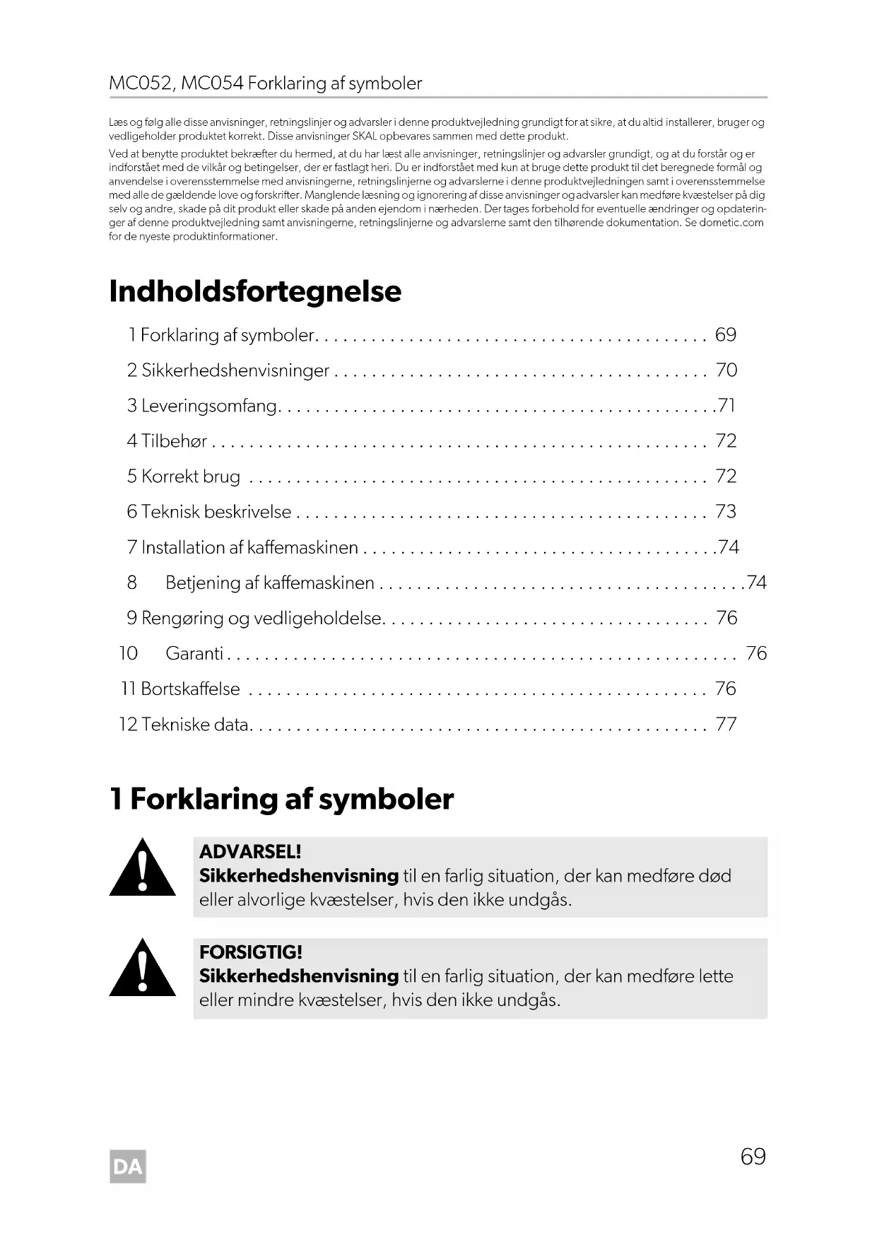 ADVARSEL! Sikkerhedshenvisning til en farlig situation, der kan medføre død eller alvorlige kvæstelser, hvis den ikke undgås. FORSIGTIG! Sikkerhedshenvisning til en farlig situation, der kan medføre lette eller mindre kvæstelser, hvis den ikke undgås. DometicMC052-MC054_IOM_4445101699_EMEA17_20xx-xx-xx.book Page 69 Tuesday, August 3, 2021 12:04 PMDA Sikkerhedshenvisninger MC052, MC054