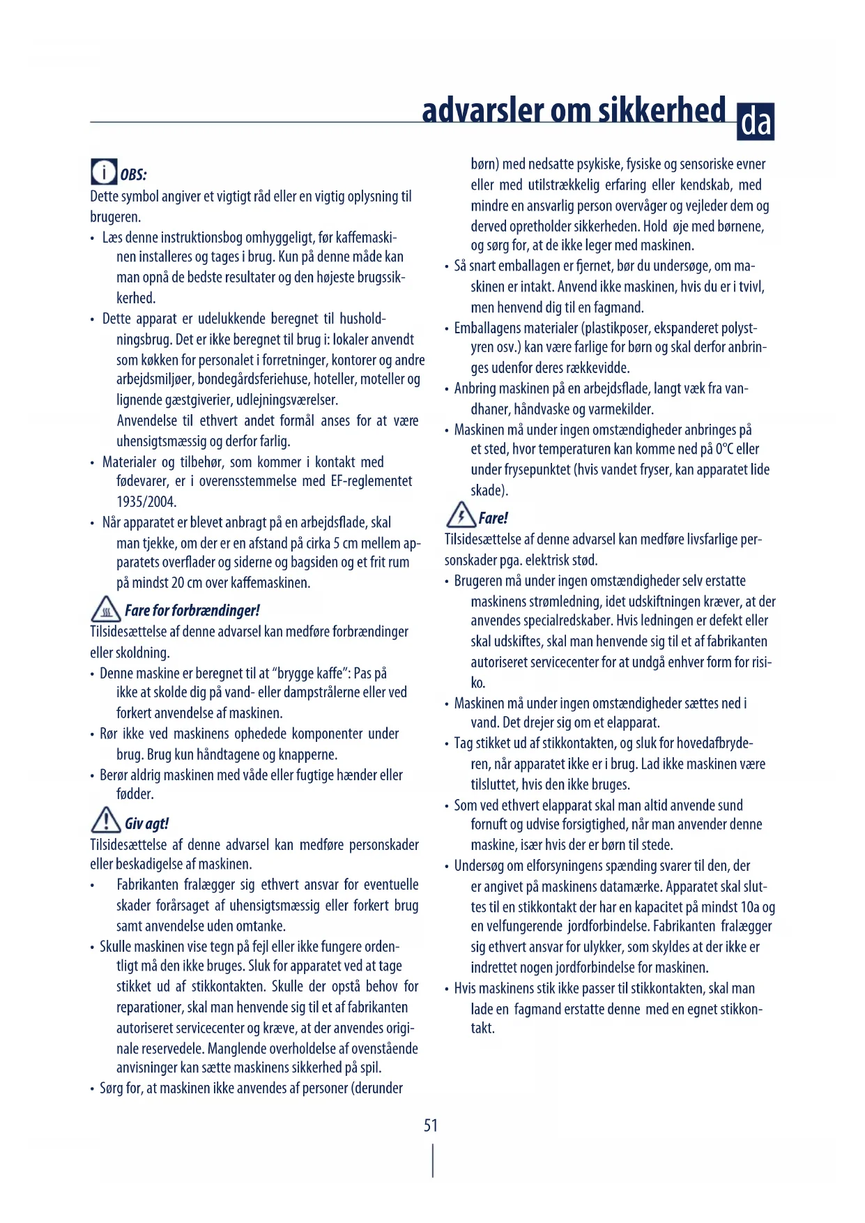 - Denne maskine er beregnet til at “brygge kae”: Pas på ikke at skolde dig på vand- eller dampstrålerne eller ved forkert anvendelse af maskinen.