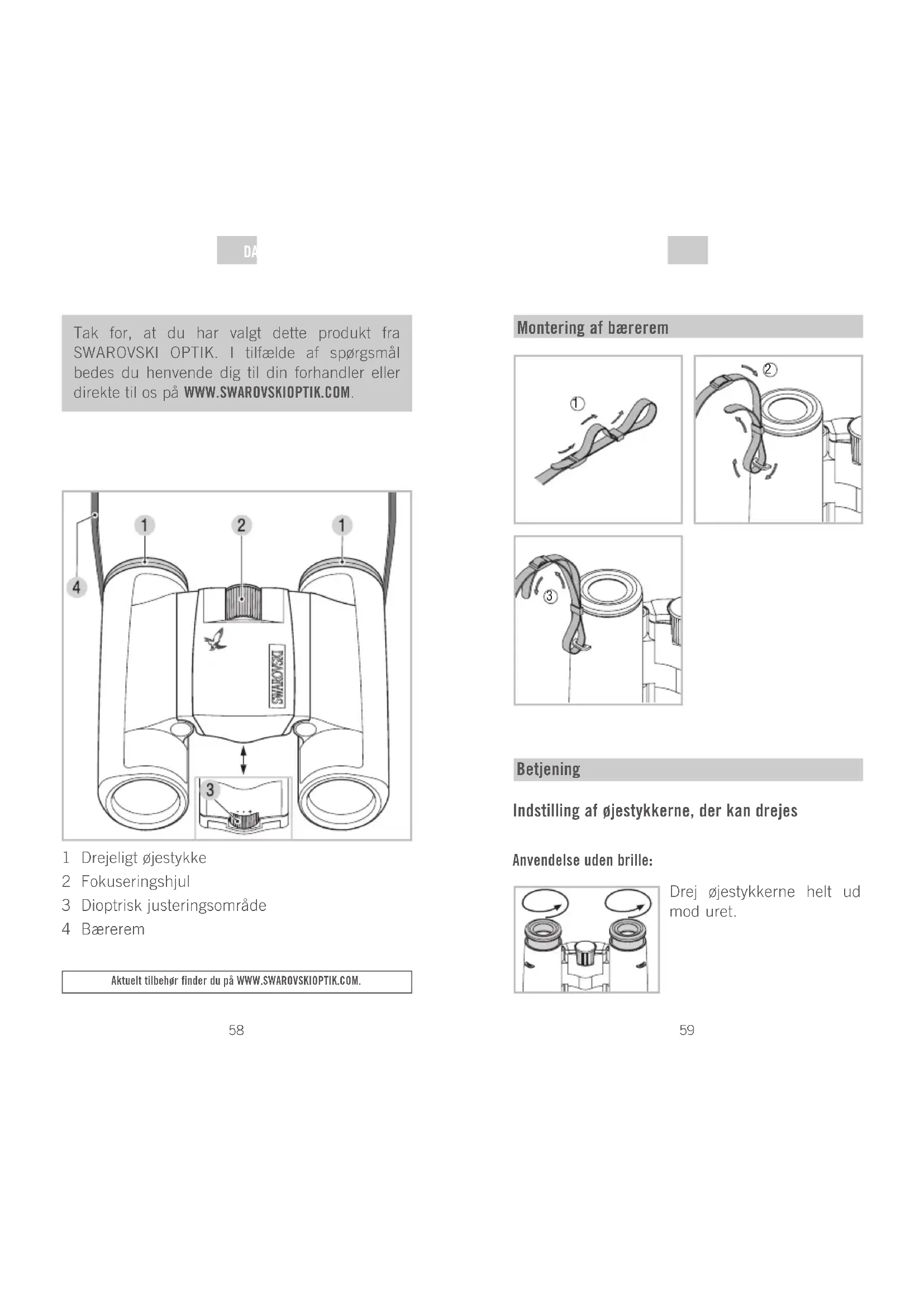 DE DADA Tak for, at du har valgt dette produkt fra SWAROVSKI OPTIK. I tilfælde af spørgsmål bedes du henvende dig til din forhandler eller direkte til os på WWW.SWAROVSKIOPTIK.COM. Aktuelt tilbehør finder du på WWW.SWAROVSKIOPTIK.COM. 1 Drejeligt øjestykke 2 Fokuseringshjul 3 Dioptrisk justeringsområde 4 Bærerem Montering af bærerem