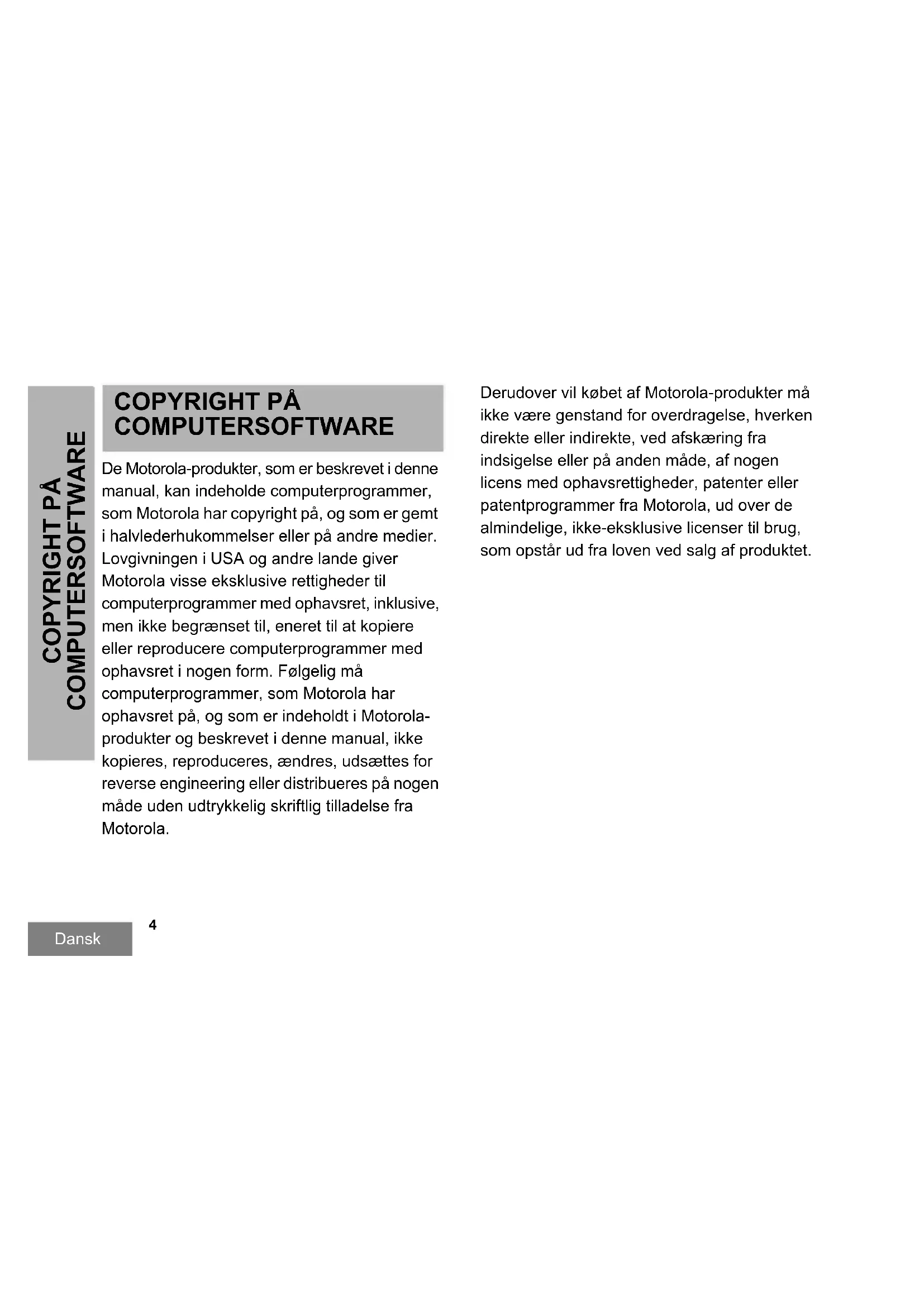 COPYRIGHT PÅ COMPUTERSOFTWARE COPYRIGHT PÅ COMPUTERSOFTWARE De Motorola-produkter, som er beskrevet i denne manual, kan indeholde computerprogrammer, som Motorola har copyright på, og som er gemt i halvlederhukommelser eller på andre medier. Lovgivningen i USA og andre lande giver Motorola visse eksklusive rettigheder til computerprogrammer med ophavsret, inklusive, men ikke begrænset til, eneret til at kopiere eller reproducere computerprogrammer med ophavsret i nogen form. Følgelig må computerprogrammer, som Motorola har ophavsret på, og som er indeholdt i Motorola- produkter og beskrevet i denne manual, ikke kopieres, reproduceres, ændres, udsættes for reverse engineering eller distribueres på nogen måde uden udtrykkelig skriftlig tilladelse fra Motorola. Derudover vil købet af Motorola-produkter må ikke være genstand for overdragelse, hverken direkte eller indirekte, ved afskæring fra indsigelse eller på anden måde, af nogen licens med ophavsrettigheder, patenter eller patentprogrammer fra Motorola, ud over de almindelige, ikke-eksklusive licenser til brug, som opstår ud fra loven ved salg af produktet.Dansk