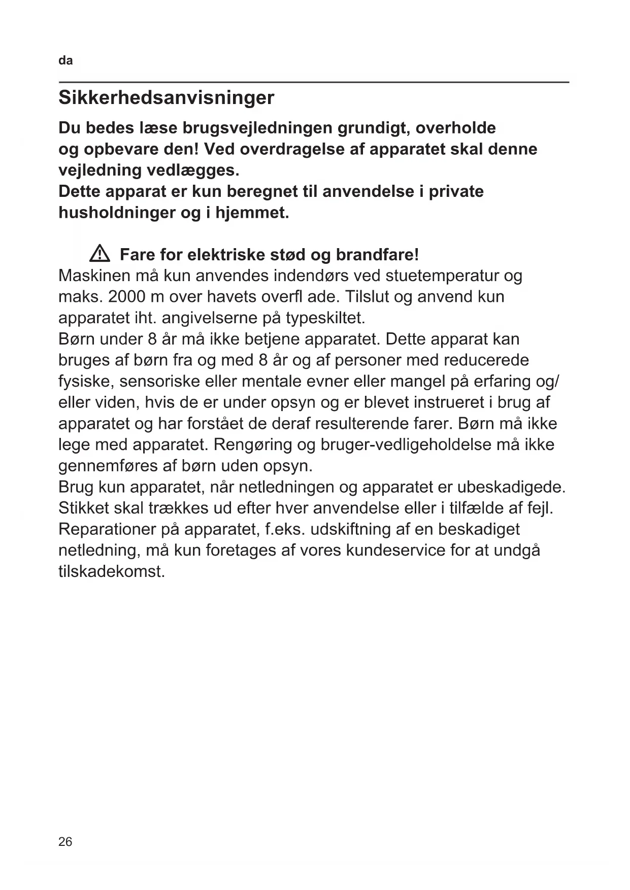 Sikkerhedsanvisninger Du bedes læse brugsvejledningen grundigt, overholde og opbevare den! Ved overdragelse af apparatet skal denne vejledning vedlægges. Dette apparat er kun beregnet til anvendelse i private husholdninger og i hjemmet. W Fare for elektriske stød og brandfare! Maskinen må kun anvendes indendørs ved stuetemperatur og maks.2000moverhavetsoverade. Tilslut og anvend kun apparatet iht. angivelserne på typeskiltet. Børn under 8 år må ikke betjene apparatet. Dette apparat kan bruges af børn fra og med 8 år og af personer med reducerede fysiske, sensoriske eller mentale evner eller mangel på erfaring og/ eller viden, hvis de er under opsyn og er blevet instrueret i brug af apparatet og har forstået de deraf resulterende farer. Børn må ikke lege med apparatet. Rengøring og bruger-vedligeholdelse må ikke gennemføres af børn uden opsyn. Brug kun apparatet, når netledningen og apparatet er ubeskadigede. Stikket skal trækkes ud efter hver anvendelse eller i tilfælde af fejl. Reparationer på apparatet, f.eks. udskiftning af en beskadiget netledning, må kun foretages af vores kundeservice for at undgå tilskadekomst.27