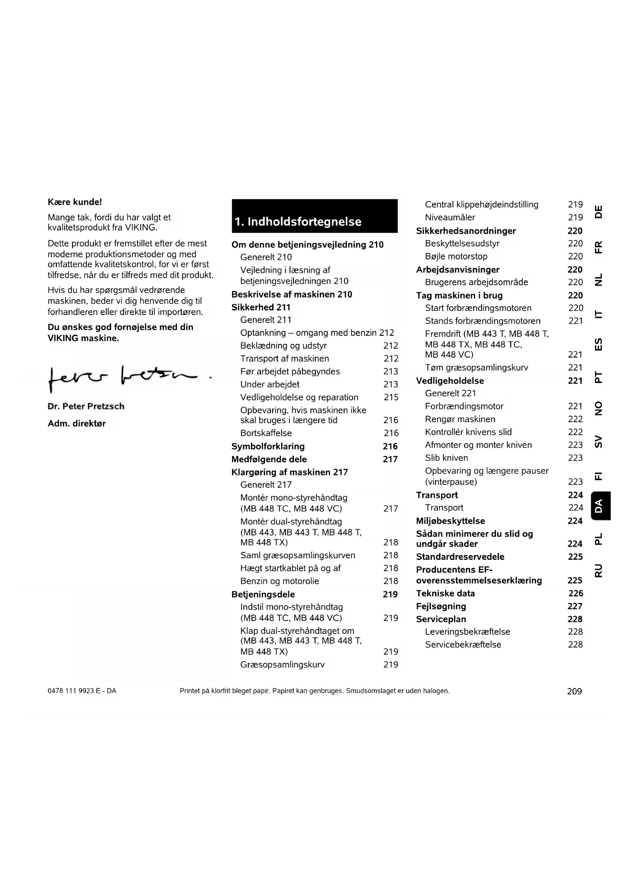 DEFRNLITESPTNOSVFIPLRU DA 0478 111 9923 E - DA Kære kunde! Mange tak, fordi du har valgt et kvalitetsprodukt fra VIKING. Dette produkt er fremstillet efter de mest moderne produktionsmetoder og med omfattende kvalitetskontrol, for vi er først tilfredse, når du er tilfreds med dit produkt. Hvis du har spørgsmål vedrørende maskinen, beder vi dig henvende dig til forhandleren eller direkte til importøren. Du ønskes god fornøjelse med din VIKING maskine. Adm. direktør Printet på klorfrit bleget papir. Papiret kan genbruges. Smudsomslaget er uden halogen.