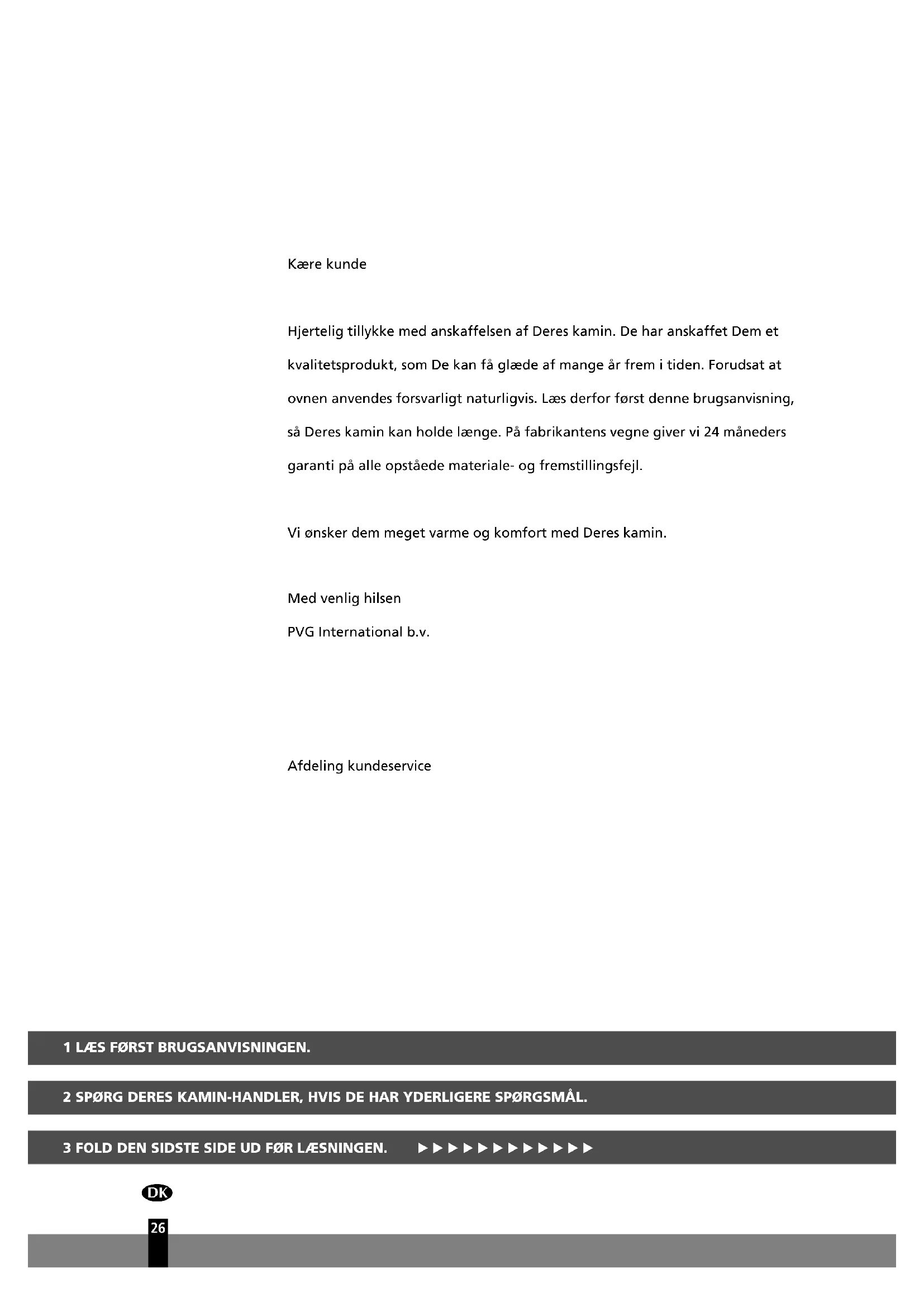 18a 18b 18dKære kunde Hjertelig tillykke med anskaffelsen af Deres kamin. De har anskaffet Dem et kvalitetsprodukt, som De kan få glæde af mange år frem i tiden. Forudsat at ovnen anvendes forsvarligt naturligvis. Læs derfor først denne brugsanvisning, så Deres kamin kan holde længe. På fabrikantens vegne giver vi 24 måneders garanti på alle opståede materiale- og fremstillingsfejl. Vi ønsker dem meget varme og komfort med Deres kamin. Med venlig hilsen PVG International b.v. Afdeling kundeservice 1 LÆS FØRST BRUGSANVISNINGEN. 2 SPØRG DERES KAMIN-HANDLER, HVIS DE HAR YDERLIGERE SPØRGSMÅL. 3 FOLD DEN SIDSTE SIDE UD FØR LÆSNINGEN. E E E E E E E E E E E E
