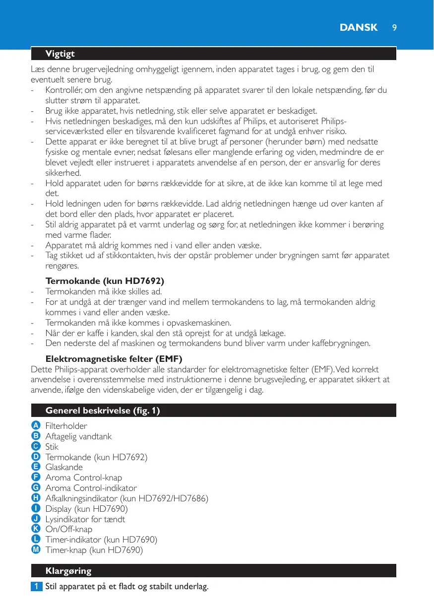 Do not throw away the appliance with the normal household waste at the end of its life, but hand it in at an official collection point for recycling. By doing this, you help to preserve the environment (Fig. 23). Guarantee & service If you need information or if you have a problem, please visit the Philips website at www.philips.com or contact the Philips Customer Care Centre in your country (you find its phone number in the worldwide guarantee leaflet). If there is no Customer Care Centre in your country, go to your local Philips dealer or contact the Service Department of Philips Domestic Appliances and Personal Care BV. Dansk Vigtigt Læs denne brugervejledning omhyggeligt igennem, inden apparatet tages i brug, og gem den til eventuelt senere brug. - Kontrollér, om den angivne netspænding på apparatet svarer til den lokale netspænding, før du slutter strøm til apparatet. - Brug ikke apparatet, hvis netledning, stik eller selve apparatet er beskadiget. - Hvis netledningen beskadiges, må den kun udskiftes af Philips, et autoriseret Philipsserviceværksted eller en tilsvarende kvalificeret fagmand for at undgå enhver risiko. - Dette apparat er ikke beregnet til at blive brugt af personer (herunder børn) med nedsatte fysiske og mentale evner, nedsat følesans eller manglende erfaring og viden, medmindre de er blevet vejledt eller instrueret i apparatets anvendelse af en person, der er ansvarlig for deres sikkerhed. - Hold apparatet uden for børns rækkevidde for at sikre, at de ikke kan komme til at lege med det. - Hold ledningen uden for børns rækkevidde. Lad aldrig netledningen hænge ud over kanten af det bord eller den plads, hvor apparatet er placeret. - Stil aldrig apparatet på et varmt underlag og sørg for, at netledningen ikke kommer i berøring med varme flader. - Apparatet må aldrig kommes ned i vand eller anden væske. - Tag stikket ud af stikkontakten, hvis der opstår problemer under brygningen samt før apparatet rengøres. Termokande (kun HD7692) Termokanden må ikke skilles ad. For at undgå at der trænger vand ind mellem termokandens to lag, må termokanden aldrig kommes i vand eller anden væske. Termokanden må ikke kommes i opvaskemaskinen. Når der er kaffe i kanden, skal den stå oprejst for at undgå lækage. Den nederste del af maskinen og termokandens bund bliver varm under kaffebrygningen.