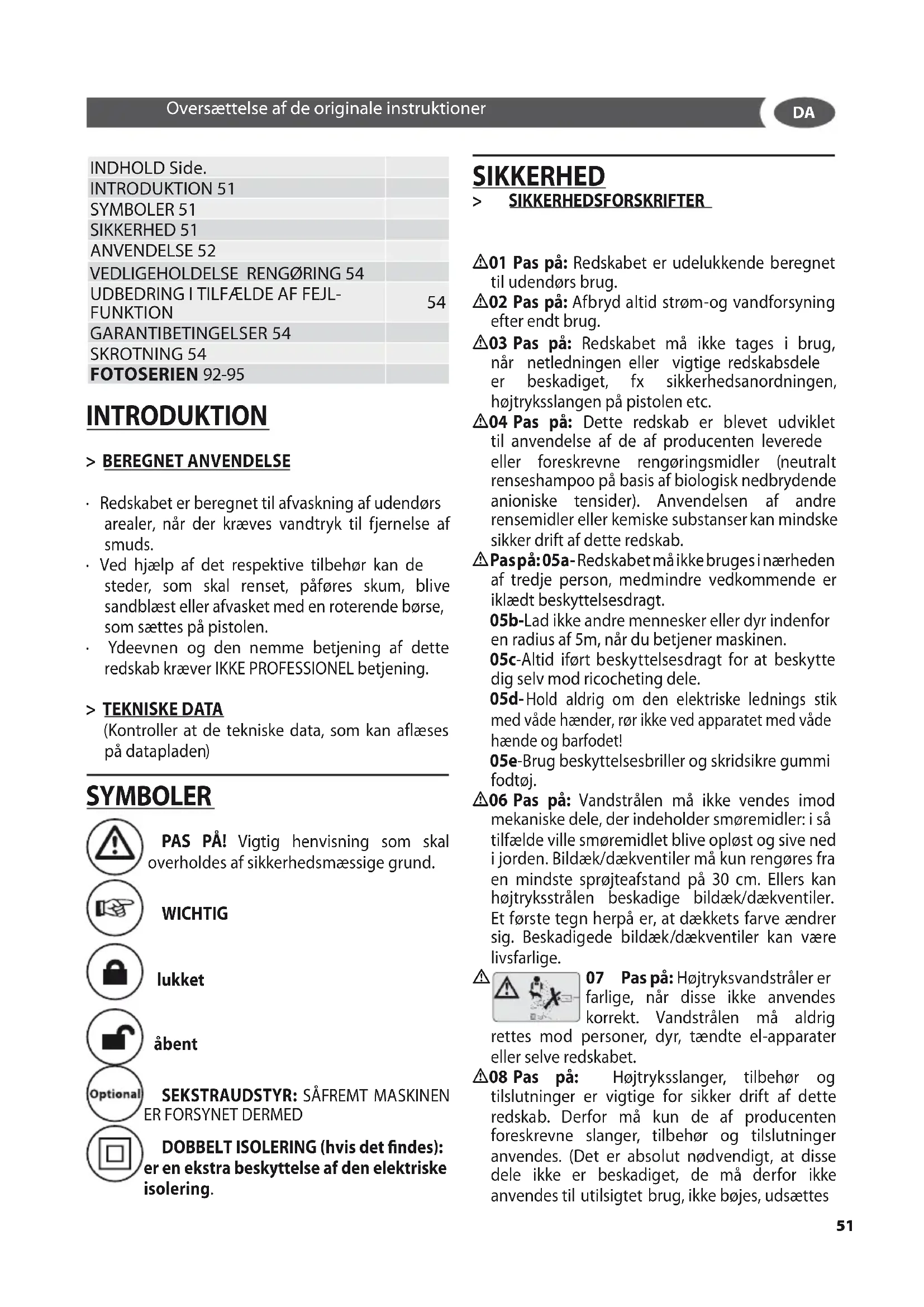 - Redskabet er beregnet til afvaskning af udendørs arealer, når der kræves vandtryk til fjernelse af smuds.