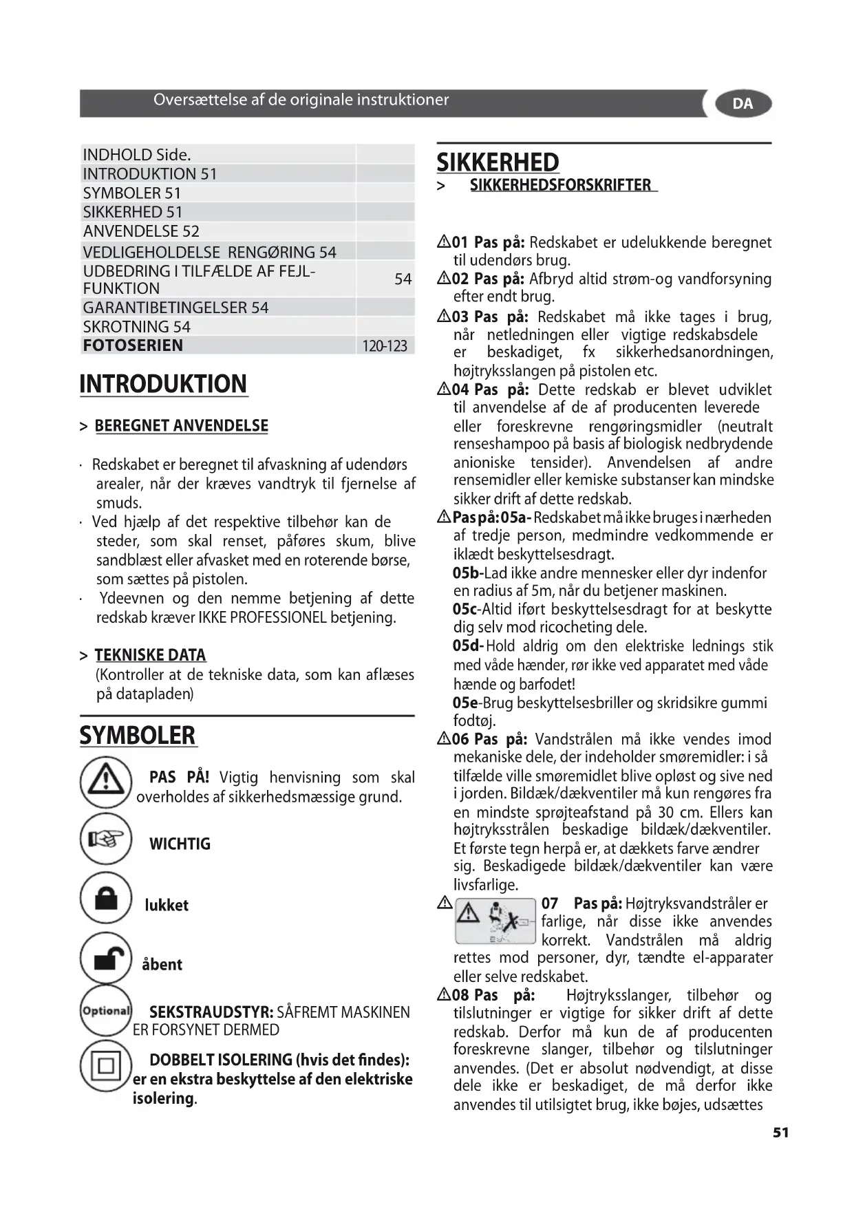07 Pas på: Højtryksvandstråler er farlige, når disse ikke anvendes korrekt. Vandstrålen må aldrig rettes mod personer, dyr, tændte el-apparater eller selve redskabet.