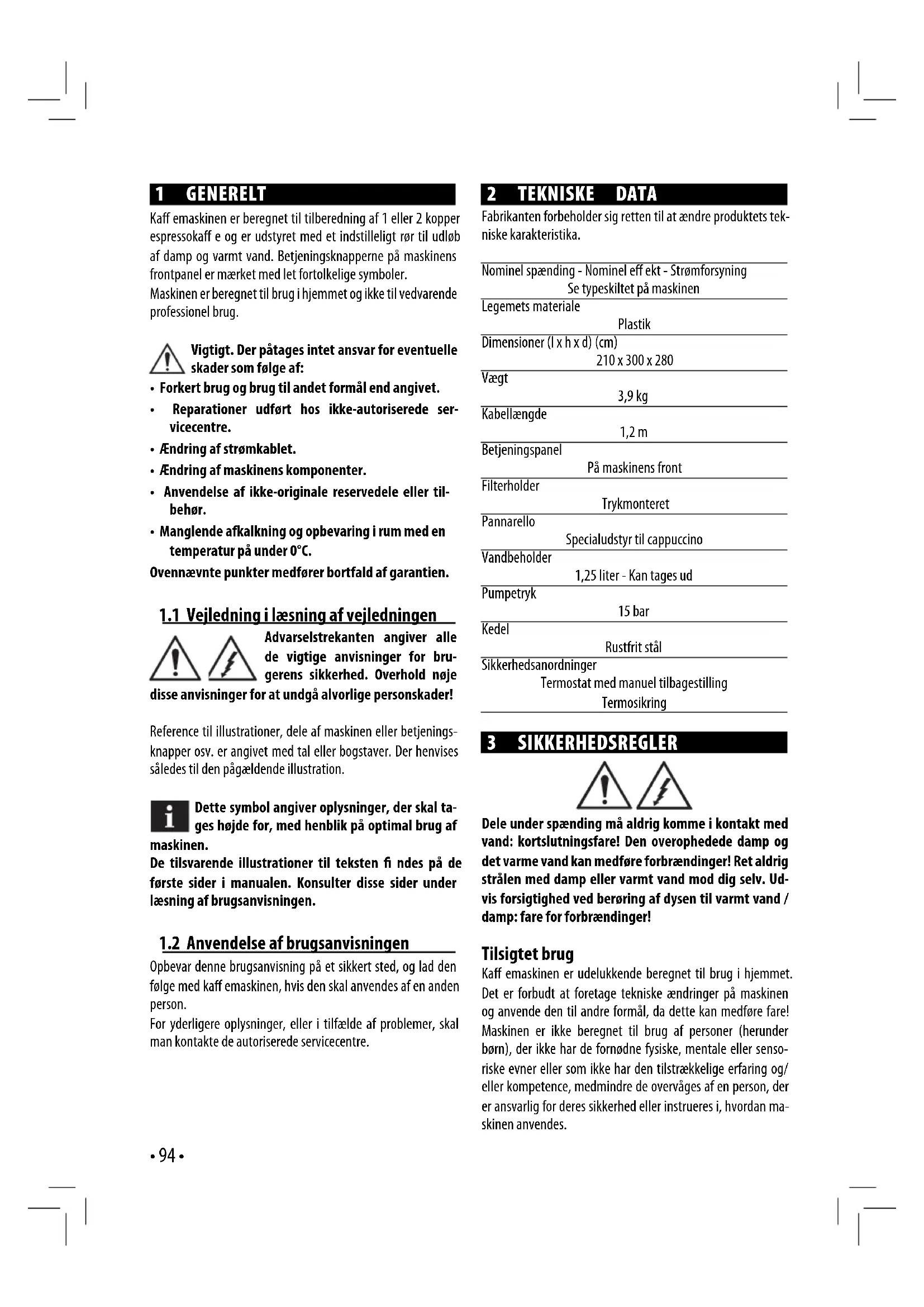 Opbevar denne brugsanvisning på et sikkert sted, og lad den følge med ka emaskinen, hvis den skal anvendes af en anden person. For yderligere oplysninger, eller i tilfælde af problemer, skal man kontakte de autoriserede servicecentre. 2 TEKNISKE DATA Fabrikanten forbeholder sig retten til at ændre produktets tek- niske karakteristika. Nominel spænding - Nominel e ekt - Strømforsyning Se typeskiltet på maskinen Legemets materiale Plastik Dimensioner (l x h x d) (cm) 210 x 300 x 280 Vægt 3,9 kg Kabellængde 1,2 m Betjeningspanel På maskinens front Filterholder Trykmonteret Pannarello Specialudstyr til cappuccino Vandbeholder 1,25 liter - Kan tages ud Pumpetryk 15 bar Kedel Rustfrit stål Sikkerhedsanordninger Termostat med manuel tilbagestilling Termosikring 3 SIKKERHEDSREGLER Dele under spænding må aldrig komme i kontakt med vand: kortslutningsfare! Den overophedede damp og det varme vand kan medføre forbrændinger! Ret aldrig strålen med damp eller varmt vand mod dig selv. Ud- vis forsigtighed ved berøring af dysen til varmt vand / damp: fare for forbrændinger! Tilsigtet brug Ka emaskinen er udelukkende beregnet til brug i hjemmet. Det er forbudt at foretage tekniske ændringer på maskinen og anvende den til andre formål, da dette kan medføre fare! Maskinen er ikke beregnet til brug af personer (herunder børn), der ikke har de fornødne fysiske, mentale eller senso- riske evner eller som ikke har den tilstrækkelige erfaring og/ eller kompetence, medmindre de overvåges af en person, der er ansvarlig for deres sikkerhed eller instrueres i, hvordan ma- skinen anvendes.• 95 • Dansk Strømforsyning Tilslut kun maskinen til en egnet stikkontakt. Spændingen skal stemme overens med værdien angivet på maskinens typeskilt. Strømkabel Tag ikke maskinen i brug, hvis strømkablet er defekt. Hvis strømkablet er defekt, skal det udskiftes af fabrikanten eller hos et af de autoriserede servicecentre. Lad ikke strømkablet løbe langs hjørner eller skarpe punkter eller varme genstande og beskyt det imod olie. Bær eller yt ikke ka emaskinen ved at trække i kablet. Træk ikke stikket ud ved at trække i kablet og rør ikke ved kablet med våde hænder. Undgå, at strømkablet falder frit ned over borde eller skabe. Personsikkerhed Hold altid børn under opsyn for at undgå, at de leger med ma- skinen. Børn er ikke klar over den fare, der er forbundet med husholdningsapparater. Lad heller ikke børn lege med maski- nens emballagemateriale. Fare for forbrænding Undgå at rette strålen med overophedet damp og/eller varmt vand mod dig selv og/eller andre personer. Brug altid de der- til indrettede håndtag eller greb. Filterholderen må aldrig afmonteres ( ernes), mens ka en er ved at løbe ud. Under opvarmningsfasen af ka eudløbsenheden kan der løbe dråber af varmt vand ud. Undgå at brygge ka e, når kontakten (