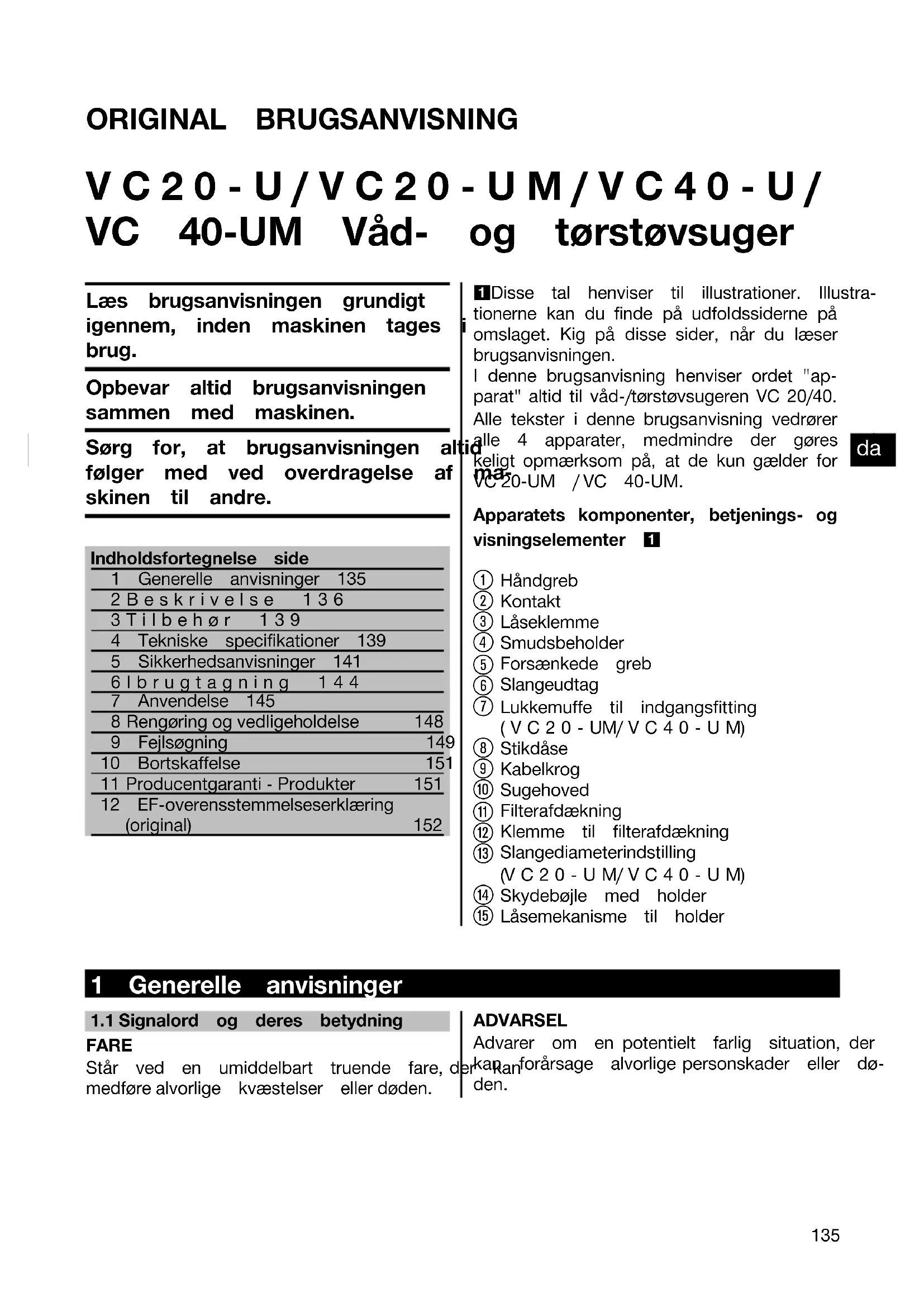 Printed: 08.07.2013 | Doc-Nr: PUB / 5071294 / 000 / 02ORIGINAL BRUGSANVISNING VC20‑U/VC20‑UM/VC40‑U/ VC 40‑UM Våd- og tørstøvsuger Læs brugsanvisningen grundigtigennem, inden maskinen tages ibrug.Opbevar altid brugsanvisningensammen med maskinen.Sørg for, at brugsanvisningen altidfølger med ved overdragelse af ma-skinen til andre.Indholdsfortegnelse side1 Generelle anvisninger 1352Beskrivelse 1363Tilbehør 1394 Tekniske specifikationer 1395 Sikkerhedsanvisninger 1416Ibrugtagning 1447 Anvendelse 145 8 Rengøring og vedligeholdelse 148 9 Fejlsøgning 14910 Bortskaffelse 151 11 Producentgaranti - Produkter 151 12 EF-overensstemmelseserklæring(original) 1521 Disse tal henviser til illustrationer. Illustra- tionerne kan du finde på udfoldssiderne på omslaget. Kig på disse sider, når du læser brugsanvisningen. I denne brugsanvisning henviser ordet "ap- parat" altid til våd-/tørstøvsugeren VC 20/40. Alle tekster i denne brugsanvisning vedrører alle 4 apparater, medmindre der gøres udtryk- keligt opmærksom på, at de kun gælder for VC 20‑UM / VC 40‑UM.Apparatets komponenter, betjenings- ogvisningselementer 1 Håndgreb Kontakt Låseklemme Smudsbeholder Forsænkede greb Slangeudtag Lukkemuffe til indgangsfitting(VC20‑UM/VC40‑UM) Stikdåse Kabelkrog Sugehoved Filterafdækning Klemme til filterafdækning Slangediameterindstilling(VC20‑UM/VC40‑UM) Skydebøjle med holder Låsemekanisme til holder 1 Generelle anvisninger