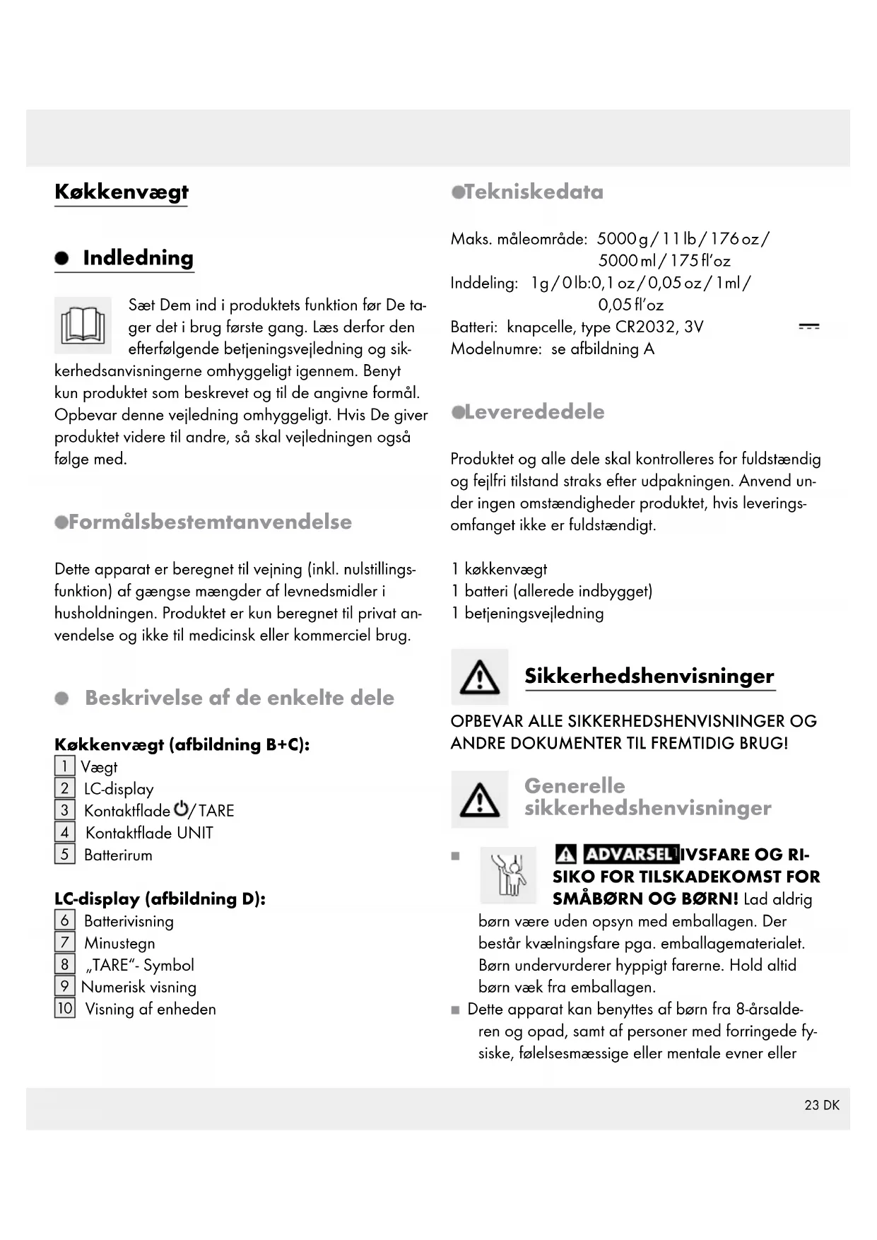 Visning af enheden Tekniske data Maks. måleområde: 5000 g / 11 lb / 176 oz / 5000 ml / 175 fl’oz Inddeling: 1g / 0 lb:0,1 oz / 0,05 oz / 1ml / 0,05 fl’oz Batteri: knapcelle, type CR2032, 3V Modelnumre: se afbildning A Leverede dele Produktet og alle dele skal kontrolleres for fuldstændig og fejlfri tilstand straks efter udpakningen. Anvend un- der ingen omstændigheder produktet, hvis leverings- omfanget ikke er fuldstændigt. 1 køkkenvægt 1 batteri (allerede indbygget) 1 betjeningsvejledning Sikkerhedshenvisninger