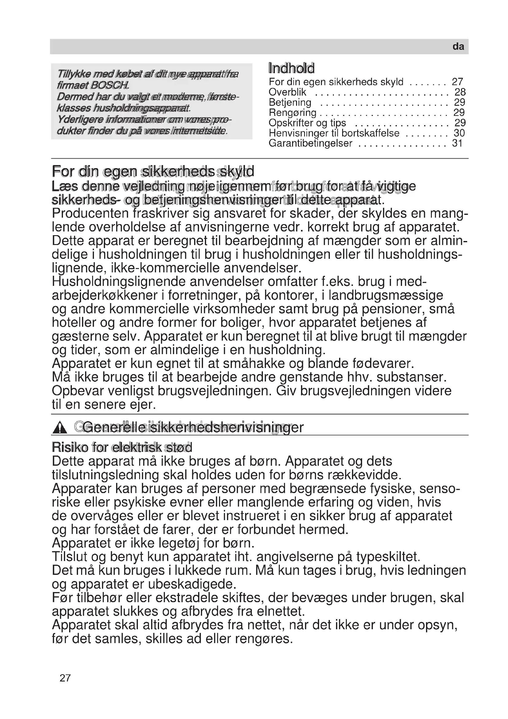- nlRobert Bosch Hausgeräte GmbH 27 Indhold For din egen sikkerheds skyld p. 27