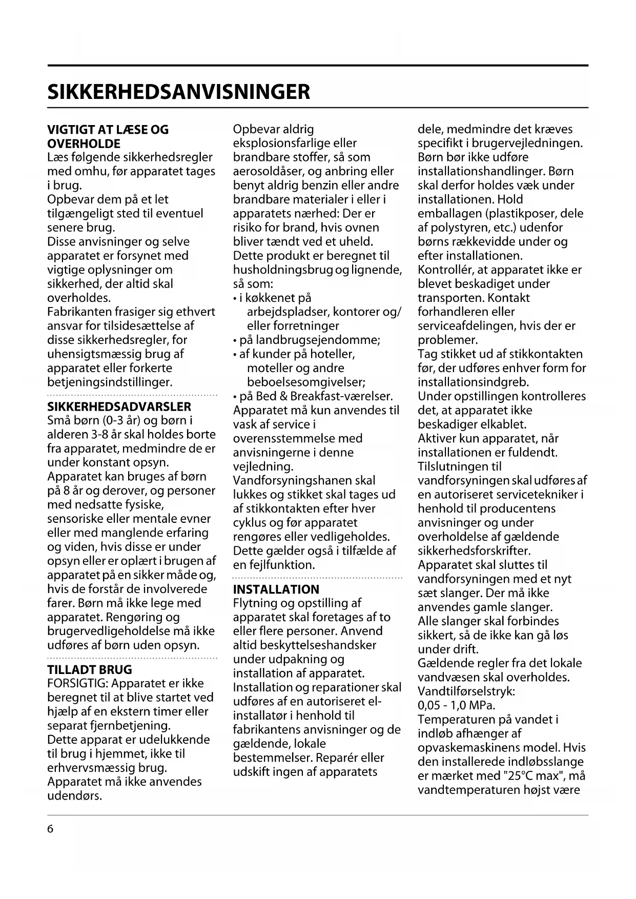 - på Bed & Breakfast-værelser. Apparatet må kun anvendes til vask af service i overensstemmelse med anvisningerne i denne vejledning. Vandforsyningshanen skal lukkes og stikket skal tages ud af stikkontakten efter hver cyklus og før apparatet rengøres eller vedligeholdes. Dette gælder også i tilfælde af en fejlfunktion. INSTALLATION Flytning og opstilling af apparatet skal foretages af to eller flere personer. Anvend altid beskyttelseshandsker under udpakning og installation af apparatet. Installation og reparationer skal udføres af en autoriseret el- installatør i henhold til fabrikantens anvisninger og de gældende, lokale bestemmelser. Reparér eller udskift ingen af apparatets dele, medmindre det kræves specifikt i brugervejledningen. Børn bør ikke udføre installationshandlinger. Børn skal derfor holdes væk under installationen. Hold emballagen (plastikposer, dele af polystyren, etc.) udenfor børns rækkevidde under og efter installationen. Kontrollér, at apparatet ikke er blevet beskadiget under transporten. Kontakt forhandleren eller serviceafdelingen, hvis der er problemer. Tag stikket ud af stikkontakten før, der udføres enhver form for installationsindgreb. Under opstillingen kontrolleres det, at apparatet ikke beskadiger elkablet. Aktiver kun apparatet, når installationen er fuldendt. Tilslutningen til vandforsyningen skal udføres af en autoriseret servicetekniker i henhold til producentens anvisninger og under overholdelse af gældende sikkerhedsforskrifter. Apparatet skal sluttes til vandforsyningen med et nyt sæt slanger. Der må ikke anvendes gamle slanger. Alle slanger skal forbindes sikkert, så de ikke kan gå løs under drift. Gældende regler fra det lokale vandvæsen skal overholdes. Vandtilførselstryk: 0,05 - 1,0 MPa. Temperaturen på vandet i indløb afhænger af opvaskemaskinens model. Hvis den installerede indløbsslange er mærket med "25°C max", må vandtemperaturen højst være7 25°C. Alle andre modeller tillader en maksimumtemperatur på 60 °C. Skær ikke slangerne over, og hvis maskinen er forsynet med et aquastopsystem, må plastdåsen for tilslutning til vand ikke sænkes ned i vandet. Hvis slangerne ikke er lange nok, bedes man henvende sig til forhandleren. Sørg for, at tilløbs- og afløbsslangerne ikke er bøjede eller klemte. Kontrollér, at tilførsels- og afløbsslangerne er tætte, inden første gangs brug. Under brug bør adgangen til bagvæggen være begrænset på en bæredygtig måde, som f.eks. ved at skubbe enheden hen til væggen eller skabe. Kontrollér, at alle fire fødder står stabilt og sikkert på gulvet, og regulér dem efter behov. Sørg desuden for, at apparatet er i vater ved hjælp af et vaterpas. Hvis apparatet installeres yderst i et modulkøkken, så den ene side af maskinen er ubeskyttet, skal området ved hængslerne tildækkes for at undgå risiko for klemning. På opvaskemaskiner med ventilationsåbninger ved bunden må åbningerne ikke dækkes til med et tæppe. ADVARSLER OM ELEKTRICITET For at opfylde de gældende sikkerhedsdirektiver for installation skal der anvendes en flerpolet kontakt med en afstand på mindst 3 mm, og apparatet skal være jordforbundet. Udskift et beskadiget strømkabel med et tilsvarende kabel. Strømkablet må kun udskiftes af en autoriseret el- installatør i henhold til producentens anvisninger og den gældende lovgivning. Henvend dig til autoriserede servicecentre. Man kontakte en autoriseret installatør, hvis det faste stik ikke passer til din stikkontakt. Strømforsyningskablet skal være tilstrækkelig langt til, at det er muligt at slutte det indbyggede apparat til strømforsyningen. Træk ikke strømforsyningskablet ud. Brug ikke forlængerledninger, multistikdåser eller adaptere. Anvend ikke dette apparat, hvis netledningen eller stikproppen er beskadiget, hvis det ikke fungerer korrekt, eller hvis det er beskadiget, eller har været tabt på gulvet. Hold strømkablet væk fra varme overflader. Efter endt installation må der ikke være direkte adgang til de elektriske dele. Rør ikke ved apparatet med våde kropsdele, og brug det ikke med bare fødder. KORREKT BRUG Vandet i opvaskemaskinen er ikke drikkeligt. Det maksimale antal kuverter er anført på produktarket. Lågen bør aldrig efterlades i den åbne position, da dette kan medføre en fare for tipning. Den åbne låge kan kun bære vægten af den udtrukne kurv inklusive service. Brug ikke den åbne låge som støtte, og undlad at sidde eller stå op på den. Anvend kun opvaske- og afspændingsmidler, som er beregnet til en automatisk opvaskemaskine. ADVARSEL: Midlerne til opvaskemaskiner er meget alkaliske. De kan være meget farlige, hvis de indtages. Undgå berøring med huden og øjnene og hold børn væk fra opvaskemaskinen, når lågen står åben. Kontrollér, at sæberummet er tomt ved vaskecyklussens afslutning. Opbevar opvaskemiddel, afspændingsmiddel og salt uden for børns rækkevidde. ADVARSEL: Knive og andre skarpe dele skal anbringes i kurven med spidsen nedad eller anbringes vandret. Vandforsyningshanen skal lukkes og stikket skal tages ud af stikkontakten efter hvert program og før opvaskemaskinen rengøres eller vedligeholdes. Dette gælder også i tilfælde af en fejlfunktion.