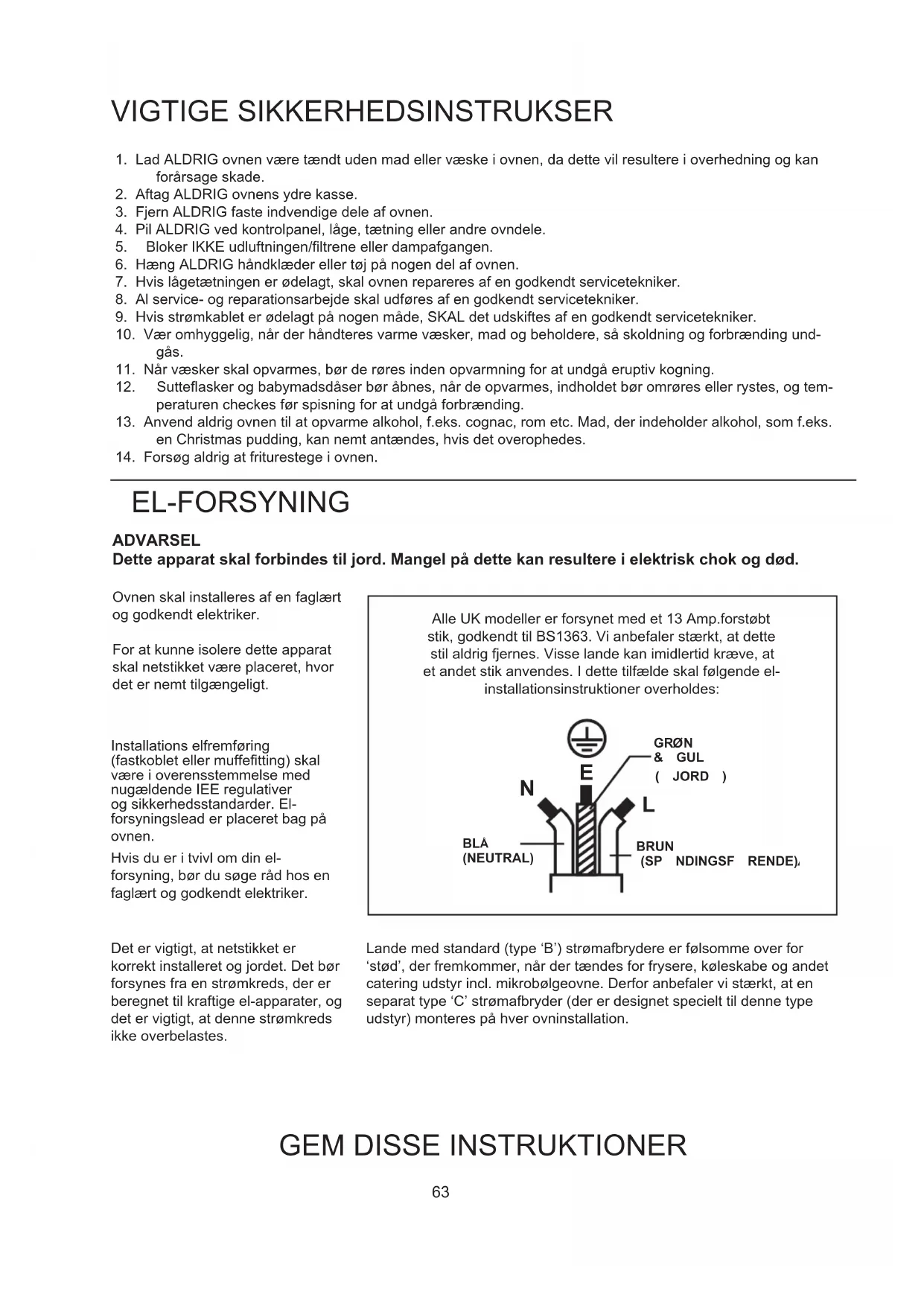 EL-FORSYNING ADVARSEL Dette apparat skal forbindes til jord. Mangel på dette kan resultere i elektrisk chok og død. Installations elfremføring (fastkobletellermuffetting)skal være i overensstemmelse med nugældende IEE regulativer og sikkerhedsstandarder. El- forsyningslead er placeret bag på ovnen. Det er vigtigt, at netstikket er korrekt installeret og jordet. Det bør forsynes fra en strømkreds, der er beregnet til kraftige el-apparater, og det er vigtigt, at denne strømkreds ikke overbelastes. Lande med standard (type ‘B’) strømafbrydere er følsomme over for ‘stød’, der fremkommer, når der tændes for frysere, køleskabe og andet catering udstyr incl. mikrobølgeovne. Derfor anbefaler vi stærkt, at en separat type ‘C’ strømafbryder (der er designet specielt til denne type udstyr) monteres på hver ovninstallation. Hvis du er i tvivl om din el- forsyning, bør du søge råd hos en faglært og godkendt elektriker. Alle UK modeller er forsynet med et 13 Amp.forstøbt stik, godkendt til BS1363. Vi anbefaler stærkt, at dette stil aldrig fjernes. Visse lande kan imidlertid kræve, at et andet stik anvendes. I dette tilfælde skal følgende el- installationsinstruktioner overholdes: Ovnen skal installeres af en faglært og godkendt elektriker. For at kunne isolere dette apparat skal netstikket være placeret, hvor det er nemt tilgængeligt.