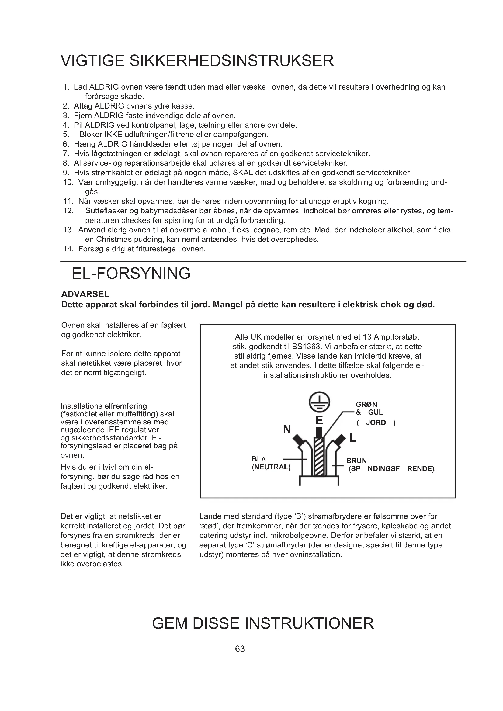 Alle UK modeller er forsynet med et 13 Amp.forstobst stik, godkendt til BS1363. Vi anbefaler staerkt, at dette stil aldrig fjernes. Visse lande kan imidlertid krave, at et andet stik anwendes. I dette tilfaelde skal falgende elinstallationsinstruktioner overholds: