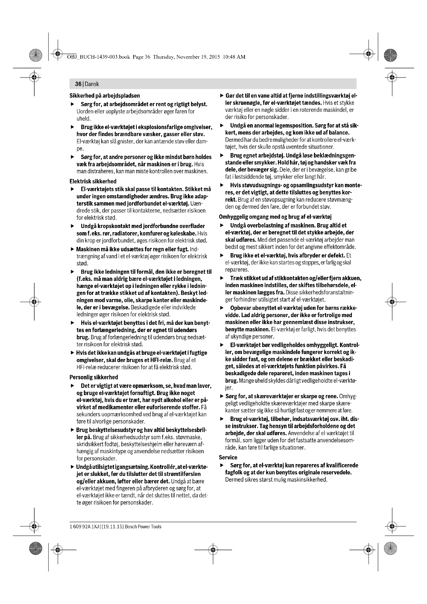 14 mm DuoTac ADVARSEL OBJ_BUCH-1439-003.book Page 35 Thursday, November 19, 2015 10:48 AM36 | Dansk 1 609 92A 1XJ | (19.11.15) Bosch Power Tools Sikkerhed på arbejdspladsen Sørg for, at arbejdsområdet er rent og rigtigt belyst. Uorden eller uoplyste arbejdsområder øger faren for uheld. Brug ikke el-værktøjet i eksplosionsfarlige omgivelser, hvor der findes brændbare væsker, gasser eller støv. El-værktøj kan slå gnister, der kan antænde støv eller dam- pe. Sørg for, at andre personer og ikke mindst børn holdes væk fra arbejdsområdet, når maskinen er i brug. Hvis man distraheres, kan man miste kontrollen over maskinen. Elektrisk sikkerhed El-værktøjets stik skal passe til kontakten. Stikket må under ingen omstændigheder ændres. Brug ikke adap- terstik sammen med jordforbundet el-værktøj. Uæn- drede stik, der passer til kontakterne, nedsætter risikoen for elektrisk stød. Undgå kropskontakt med jordforbundne overflader som f.eks. rør, radiatorer, komfurer og køleskabe. Hvis din krop er jordforbundet, øges risikoen for elektrisk stød. Maskinen må ikke udsættes for regn eller fugt. Ind- trængning af vand i et el-værktøj øger risikoen for elektrisk stød. Brug ikke ledningen til formål, den ikke er beregnet til (f.eks. må man aldrig bære el-værktøjet i ledningen, hænge el-værktøjet op i ledningen eller rykke i lednin- gen for at trække stikket ud af kontakten). Beskyt led- ningen mod varme, olie, skarpe kanter eller maskinde- le, der er i bevægelse. Beskadigede eller indviklede ledninger øger risikoen for elektrisk stød. Hvis el-værktøjet benyttes i det fri, må der kun benyt- tes en forlængerledning, der er egnet til udendørs brug. Brug af forlængerledning til udendørs brug nedsæt- ter risikoen for elektrisk stød. Hvis det ikke kan undgås at bruge el-værktøjet i fugtige omgivelser, skal der bruges et HFI-relæ. Brug af et HFI-relæ reducerer risikoen for at få elektrisk stød. Personlig sikkerhed Det er vigtigt at være opmærksom, se, hvad man laver, og bruge el-værktøjet fornuftigt. Brug ikke noget el-værktøj, hvis du er træt, har nydt alkohol eller er på- virket af medikamenter eller euforiserende stoffer. Få sekunders uopmærksomhed ved brug af el-værktøjet kan føre til alvorlige personskader. Brug beskyttelsesudstyr og hav altid beskyttelsesbril- ler på. Brug af sikkerhedsudstyr som f.eks. støvmaske, skridsikkert fodtøj, beskyttelseshjelm eller høreværn af- hængig af maskintype og anvendelse nedsætter risikoen for personskader. Undgå utilsigtet igangsætning. Kontrollér, at el-værktø- jet er slukket, før du tilslutter det til strømtilførslen og/eller akkuen, løfter eller bærer det. Undgå at bære el-værktøjet med fingeren på afbryderen og sørg for, at el-værktøjet ikke er tændt, når det sluttes til nettet, da det- te øger risikoen for personskader. Gør det til en vane altid at fjerne indstillingsværktøj el- ler skruenøgle, før el-værktøjet tændes. Hvis et stykke værktøj eller en nøgle sidder i en roterende maskindel, er der risiko for personskader. Undgå en anormal legemsposition. Sørg for at stå sik- kert, mens der arbejdes, og kom ikke ud af balance. Dermed har du bedre muligheder for at kontrollere el-værk- tøjet, hvis der skulle opstå uventede situationer. Brug egnet arbejdstøj. Undgå løse beklædningsgen- stande eller smykker. Hold hår, tøj og handsker væk fra dele, der bevæger sig. Dele, der er i bevægelse, kan gribe