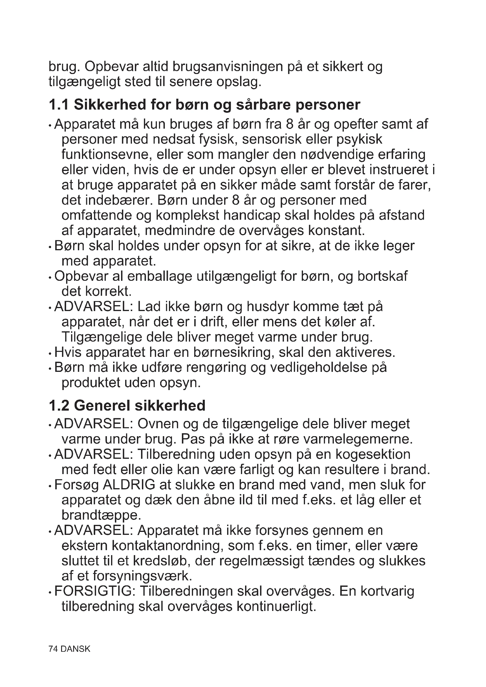 - FORSIGTIG: Tilberedningen skal overvåges. En kortvarig tilberedning skal overvåges kontinuerligt. 74 DANSK• ADVARSEL: Fare for brand: Opbevar ikke genstande på overfladerne på kogepladen.