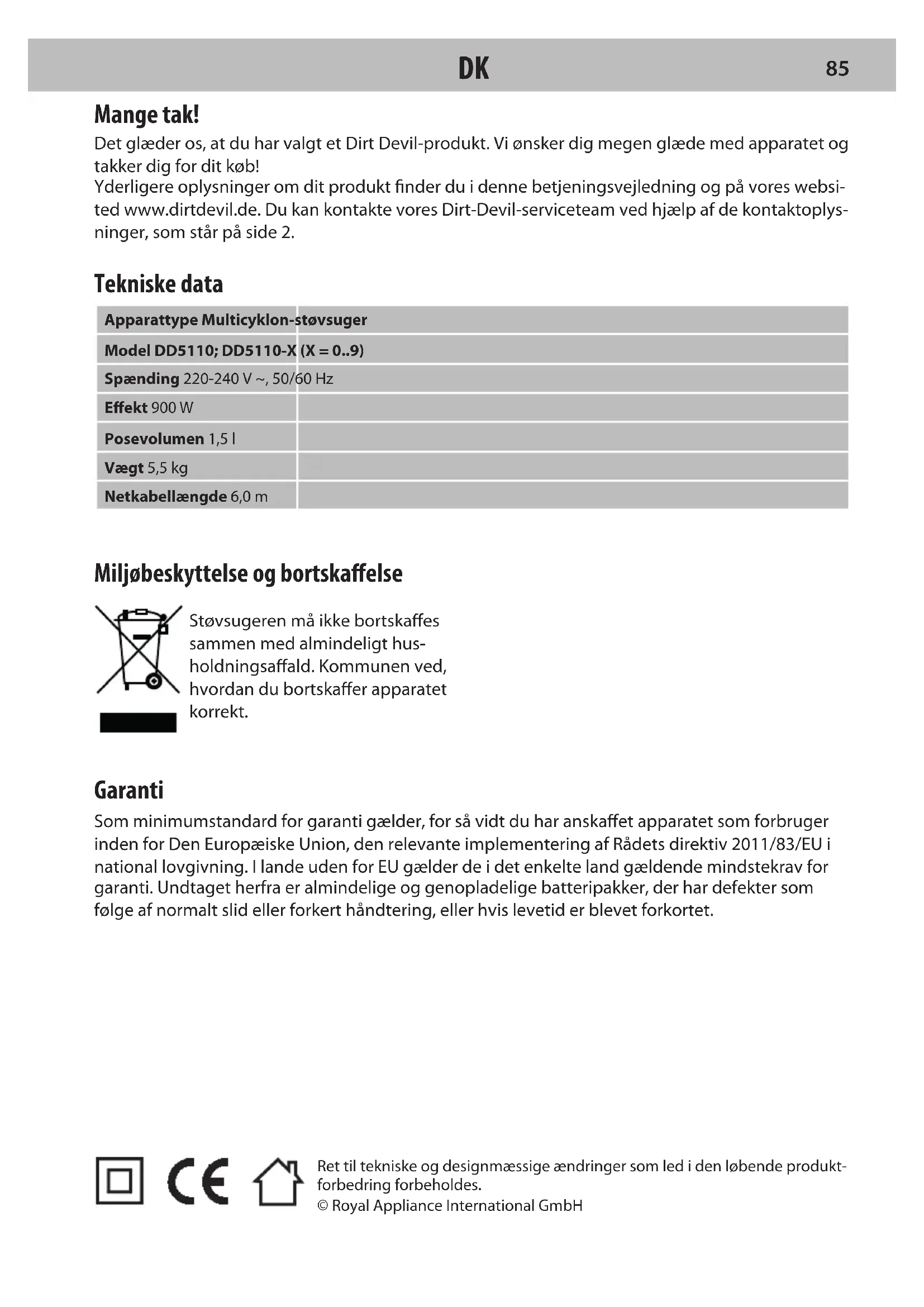 SERet til tekniske og designmæssige ændringer som led i den løbende produkt- forbedring forbeholdes. © Royal Appliance International GmbH Mange tak! Det glæder os, at du har valgt et Dirt Devil-produkt. Vi ønsker dig megen glæde med apparatet og takker dig for dit køb! Yderligere oplysninger om dit produkt nder du i denne betjeningsvejledning og på vores websi- ted www.dirtdevil.de. Du kan kontakte vores Dirt-Devil-serviceteam ved hjælp af de kontaktoplys- ninger, som står på side 2. Tekniske data Apparattype Multicyklon-støvsuger Model DD5110; DD5110-X (X = 0..9) Spænding 220-240 V ~, 50/60 Hz Eekt 900 W Posevolumen 1,5 l Vægt 5,5 kg Netkabellængde 6,0 m Miljøbeskyttelse og bortskaelse Støvsugeren må ikke bortskaes sammen med almindeligt hus- holdningsaald. Kommunen ved, hvordan du bortskaer apparatet korrekt. Garanti Som minimumstandard for garanti gælder, for så vidt du har anskaet apparatet som forbruger inden for Den Europæiske Union, den relevante implementering af Rådets direktiv 2011/83/EU i national lovgivning. I lande uden for EU gælder de i det enkelte land gældende mindstekrav for garanti. Undtaget herfra er almindelige og genopladelige batteripakker, der har defekter som følge af normalt slid eller forkert håndtering, eller hvis levetid er blevet forkortet.