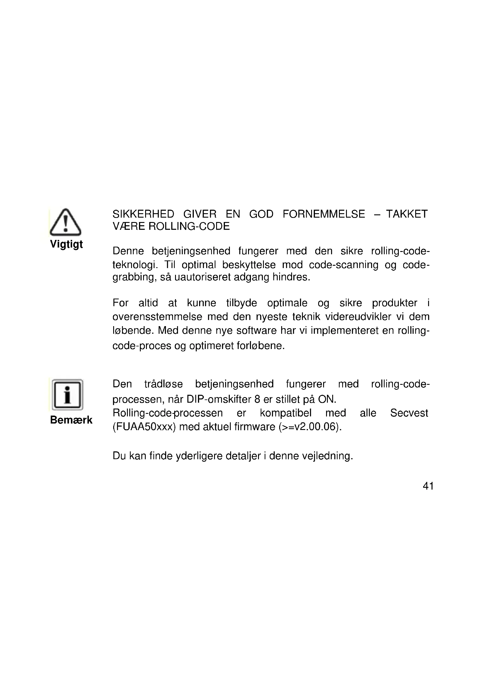 Den tradlse betjeningsenhed fungerer med rolling-codeprocessen, när DIP-omskifter 8 er stillet på ON. Rolling-code-processen er kompatibel med alle Secvest (FUAA50xxx) med aktuel firmware (>=v2.00.06) .