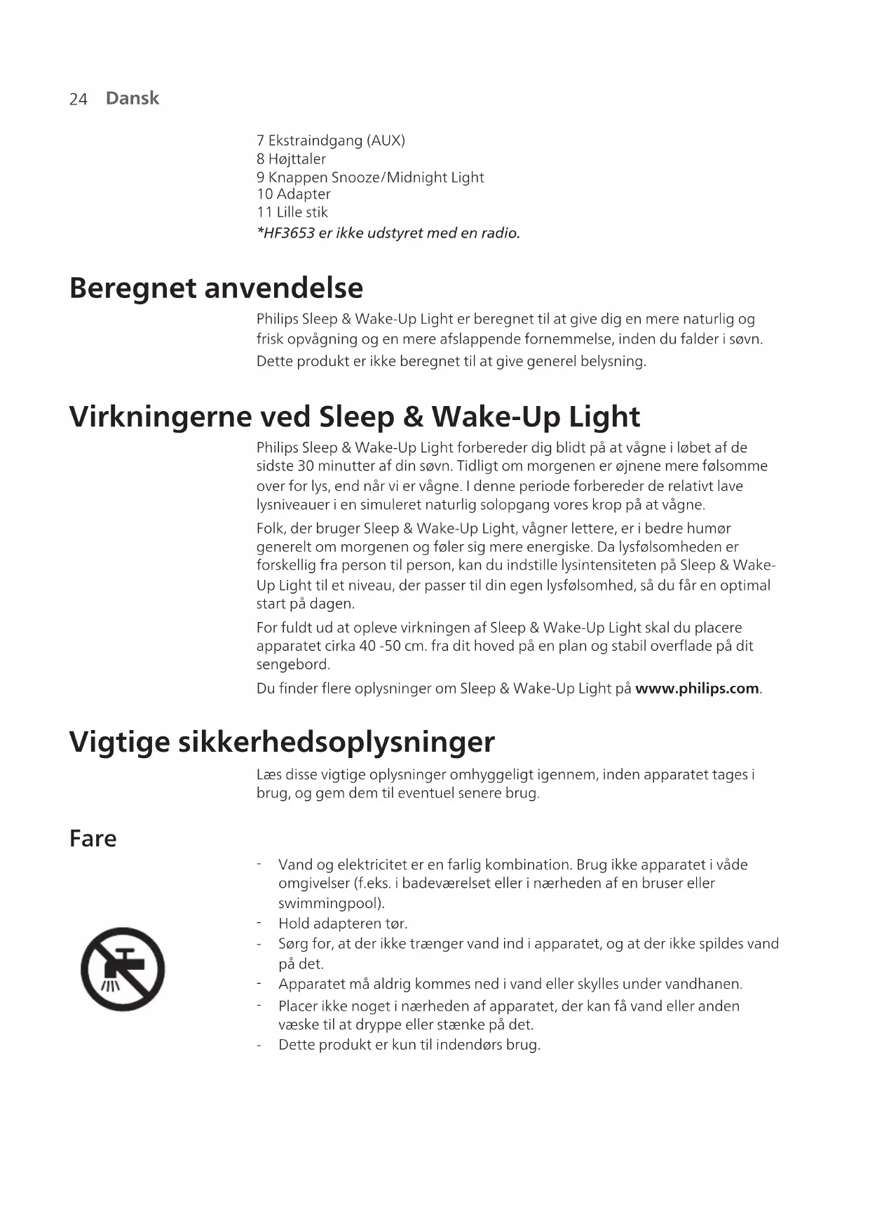 Følg den nationale lovgivning om særskilt indsamling af elektriske og elektroniske produkter. Korrekt bortskaffelse er med til at forhindre negativ påvirkning af miljøet og menneskers helbred. Reklamationsret og support Hvis du har brug for information eller support, kan du besøge www.philips.com/support eller kontakte din Philips-forhandler. Du kan også kontakte det lokale Philips-kundecenter (du kan finde kontaktoplysninger i den internationale garantifolder). Fejlfinding Dette afsnit opsummerer de mest almindelige problemer, der kan forekomme ved brug af apparatet. Har du brug for yderligere hjælp og vejledning, så besøg www.philips.com/support for at se en liste med ofte stillede spørgsmål, eller kontakt dit lokale Philips Kundecenter. Problem Løsning Apparatet virker slet ikke. Måske er adapteren ikke sat korrekt i stikkontakten. Sæt adapteren korrekt i stikkontakten. Måske er stikket er ikke sat rigtigt i apparatet. Sæt stikket korrekt i apparatet. Måske er der opstået strømsvigt. Kontroller, at strømforsyningen er i orden ved at tilslutte et andet apparat. Apparatet fungerer korrekt, men pæren tænder ikke længere. Apparatet gør brug af holdbar LED-teknologi. Lampen skal kunne holde i lang tid. Hvis lampen alligevel holder op med at lyse, skal du gå til www.philips.com/support eller kontakte kundecenteret. Apparatet reagerer ikke, når jeg forsøger at indstille de forskellige funktioner. Du kan gå tilbage til fabriksindstillingerne ved at trykke på nulstillingsknappen bag på apparatet (se "Generel beskrivelse"). Hvis du trykker på nulstillingsknappen, skal opsætningsguiden indstilles igen. Lampen tændes ikke, når alarmen går i gang. Måske har du valgt en lysintensitet, der er for lav. Sæt lysintensiteten op i din vækkeprofil. Måske har du slået alarmfunktionen fra. Alarmikonet vises på displayet, når alarmfunktionen er aktiv.36 Dansk Problem Løsning Lampen lyser ikke op med det samme, når jeg tænder for den. Det kan tage mellem 1 og 5 sekunder at tænde lampen, afhængigt af den valgte lysintensitet. Jeg kan ikke høre vækkelyden, når alarmen går i gang. Måske har du valgt et lydniveau, der er for lavt. Du indstiller til et højere lydniveau ved at forøge lydniveauet for vækkelyden i din vækkeprofil. Når du har indstillet en alarm, vil du først se lyset for vækkekurven. Alarmlyden begynder ikke at lyde, inden den indstillede alarmtid. Du kan ændre varigheden af kurven for Wake up Light. Måske har du slået alarmfunktionen fra. Alarmikonet vises på displayet, når alarmfunktionen er aktiv. Hvis du har valgt FM-radio* som alarmlyd, skal du tænde FM-radioen*, efter du har slået alarmen fra for at kontrollere, om FM-radioen* virker. Kontrollér, om FM-radioen* er korrekt indstillet på en radiostation. Ellers skal frekvensen indstilles. Hvis radioen ikke virker, bedes du kontakte dit lokale kundecenter. FM-radioen* virker ikke. Lydstyrken er muligvis indstillet for lavt. Skru op for lydstyrken. Kontrollér, om FM-radioen* er korrekt indstillet på en radiostation. Ellers skal frekvensen indstilles. Drej antennen i en anden retning. Kontrollér, at antennen er helt rullet ud. Kontakt det lokale kundecenter. Der kommer en knasende lyd fra FM- radioen*. Måske er radiosignalet svagt. Indstil frekvensen, og/eller drej antennen i en anden retning. Kontrollér, at antennen er helt rullet ud. Alarmen gik i gang i går, men ikke i dag. Måske har du slået alarmfunktionen fra. Alarmikonet vises på displayet, når alarmfunktionen er aktiv. Måske har du valgt et lydniveau og/eller en lysintensitet, der er for lav. Vælg et højere lydniveau og/eller en højere lysintensitet i din vækkeprofil. I forbindelse med strømsvigt vil uret gå videre i op til 8 timer. Måske strømsvigtet varet længere. I så tilfælde skal du indstille klokkeslættet igen. Jeg ville bruge snooze- funktionen, men alarmen gik ikke i gang igen efter 9 minutter. Tryk oven på Sleep & Wake-Up Light for at vælge snooze. Hvis du trykker på knappen for at slå alarmen fra, deaktiveres alarmprofilen for den pågældende dag. Lyset vækker mig for tidligt. Måske er den lysintensitet, du har indstillet, ikke den, der passer bedst til dig. Prøv med en lavere lysintensitet, hvis du vågner for tidligt. Du kan også ændre varigheden af kurven for vækkelyset. Hvis lysintensitet 1 ikke er lav nok, kan du flytte apparatet længere væk fra sengen.37 Dansk Problem Løsning Lyset vækker mig for sent. Måske har du valgt en for lav lysintensitet. Vælg en højere lysintensitet. Måske er apparatet placeret i lavere højde end dit hoved. Sørg for at apparatet er placeret således, at lyset ikke blokeres af sengen, dynen, tæppet eller puden. Sørg også for, at apparatet ikke er placeret for langt væk. Jeg kan ikke slå funktionen Midnight Light til eller fra. Sørg for, at du trykker det rigtige sted (øverst på bagsiden) på apparatet. Jeg kan ikke streame musik via USB. USB-stikket er kun beregnet til opladning af mobiltelefonen. Du kan ikke streame musik til Sleep & Wake-Up Light. AUX-indgangen fungerer ikke korrekt. Prøv at skrue op eller ned for lydstyrken på din mobiltelefon. Prøv eventuelt også at justere lydstyrken på apparatet. Apparatet udsender pludselig en biplyd. Det er backup-alarmen, der er gået i gang. Det indbyggede ur og backup- alarmen vil stadig virke i mindst 8 timer mere. Hvis der er indstillet en alarm til denne backup-periode, bliver den slået fra. Alarmlyden stopper automatisk efter ca. 30 sekunder. Du kan også afbryde alarmlyden med det samme ved kortvarigt at slutte apparatet til strøm. Hvis du vil forhindre, at backup-alarmen går i gang, når strømmen afbrydes (f.eks. under opbevaring), skal du deaktivere alarmerne, før du afbryder strømmen til apparatet. *HF3653 er ikke udstyret med en radio. Open source- og tredjepartssoftware En kopi af open source-softwaren og licensaftalen for den tredjepartsoftware kan findes på webstede