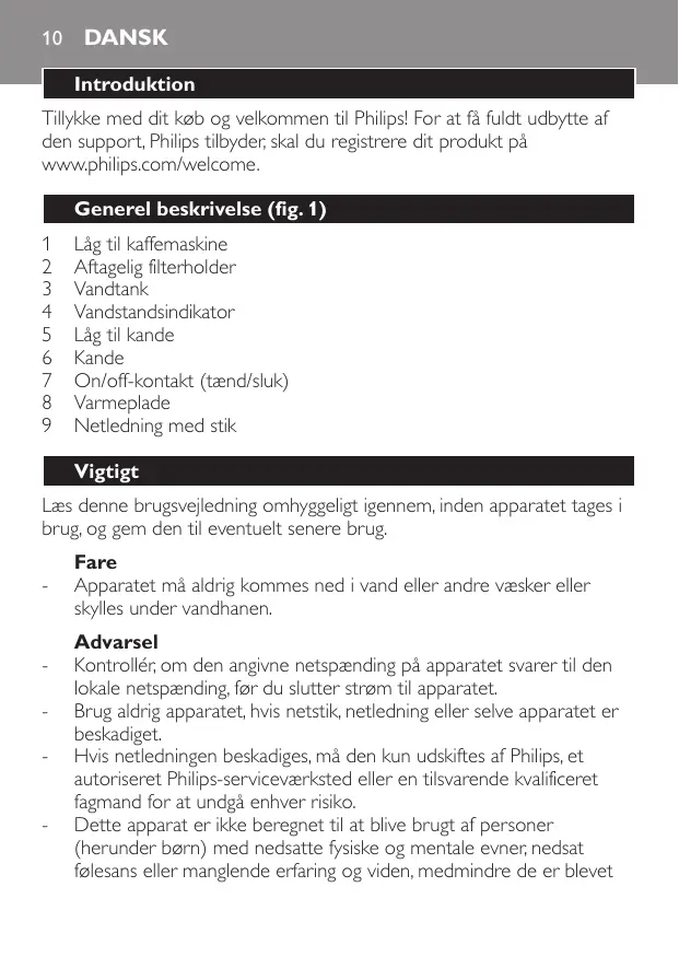 Verseuse Interrupteur on/off Plaque chauffante Cordon d’alimentation avec fiche secteur -- Avant de brancher l’appareil, vérifiez que la tension indiquée sur l’appareil correspond à la tension supportée par le secteur local. -- N’utilisez jamais l’appareil si la fiche, le cordon d’alimentation ou l’appareil lui-même est endommagé. -- Si le cordon d’alimentation est endommagé, il doit être remplacé par Philips, par un Centre Service Agréé Philips ou par un technicien qualifié afin d’éviter tout accident. -- Cet appareil n’est pas destiné à être utilisé par des personnes (notamment des enfants) dont les capacités physiques, sensorielles ou intellectuelles sont réduites, ou par des personnes manquant d’expérience ou de connaissances, à moins que celles-ci ne soient
