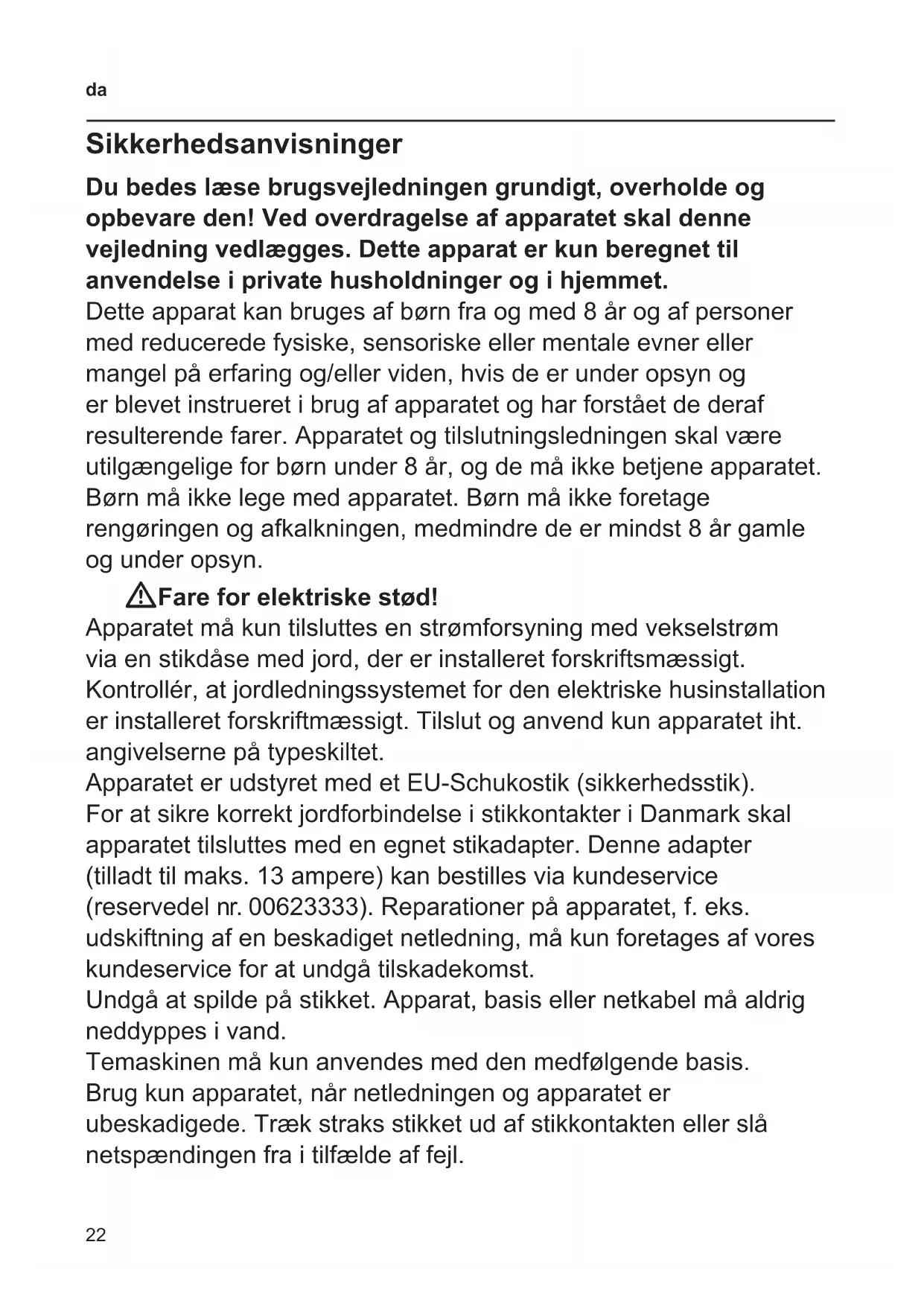 Sikkerhedsanvisninger Du bedes læse brugsvejledningen grundigt, overholde og opbevare den! Ved overdragelse af apparatet skal denne vejledning vedlægges. Dette apparat er kun beregnet til anvendelse i private husholdninger og i hjemmet. Dette apparat kan bruges af børn fra og med 8 år og af personer med reducerede fysiske, sensoriske eller mentale evner eller mangel på erfaring og/eller viden, hvis de er under opsyn og er blevet instrueret i brug af apparatet og har forstået de deraf resulterende farer. Apparatet og tilslutningsledningen skal være utilgængelige for børn under 8 år, og de må ikke betjene apparatet. Børn må ikke lege med apparatet. Børn må ikke foretage rengøringen og afkalkningen, medmindre de er mindst 8 år gamle og under opsyn. WFare for elektriske stød! Apparatet må kun tilsluttes en strømforsyning med vekselstrøm via en stikdåse med jord, der er installeret forskriftsmæssigt. Kontrollér, at jordledningssystemet for den elektriske husinstallation er installeret forskriftmæssigt. Tilslut og anvend kun apparatet iht. angivelserne på typeskiltet. Apparatet er udstyret med et EU-Schukostik (sikkerhedsstik). For at sikre korrekt jordforbindelse i stikkontakter i Danmark skal apparatet tilsluttes med en egnet stikadapter. Denne adapter (tilladt til maks. 13 ampere) kan bestilles via kundeservice (reservedel nr. 00623333). Reparationer på apparatet, f. eks. udskiftning af en beskadiget netledning, må kun foretages af vores kundeservice for at undgå tilskadekomst. Undgå at spilde på stikket. Apparat, basis eller netkabel må aldrig neddyppes i vand. Temaskinen må kun anvendes med den medfølgende basis. Brug kun apparatet, når netledningen og apparatet er ubeskadigede. Træk straks stikket ud af stikkontakten eller slå netspændingen fra i tilfælde af fejl.23