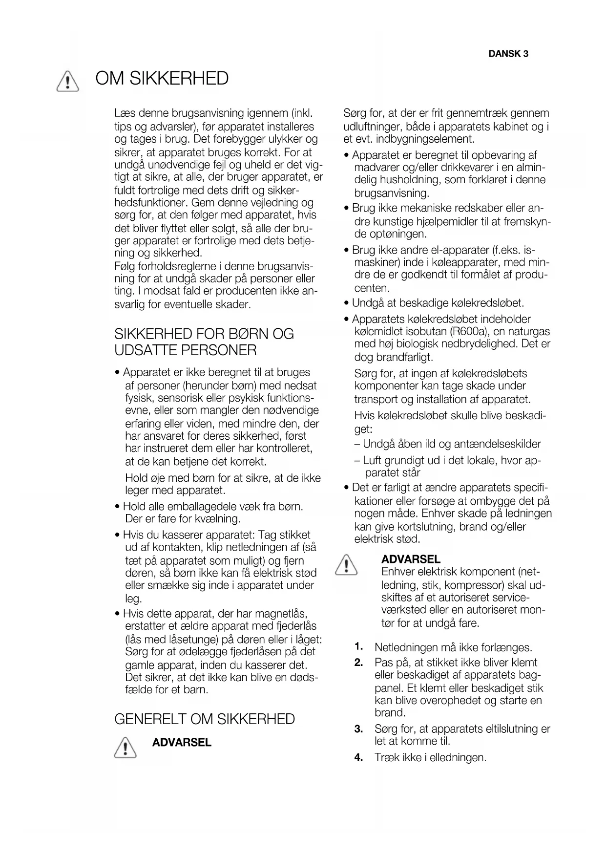 www.electrolux.comOM SIKKERHED Læs denne brugsanvisning igennem (inkl. tips og advarsler), før apparatet installeres og tages i brug. Det forebygger ulykker og sikrer, at apparatet bruges korrekt. For at undgå unødvendige fejl og uheld er det vig- tigt at sikre, at alle, der bruger apparatet, er fuldt fortrolige med dets drift og sikker- hedsfunktioner. Gem denne vejledning og sørg for, at den følger med apparatet, hvis det bliver flyttet eller solgt, så alle der bru- ger apparatet er fortrolige med dets betje- ning og sikkerhed. Følg forholdsreglerne i denne brugsanvis- ning for at undgå skader på personer eller ting. I modsat fald er producenten ikke an- svarlig for eventuelle skader.